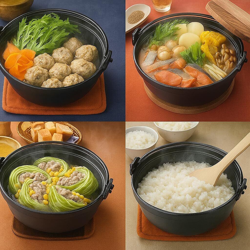 【優れた蓄熱性と柔らかい熱あたり】鉄鋳物ならではの特性で食材の旨味をじっくり引き出し、いつもの鍋料理や湯豆腐、うどん、ラーメンもさらに美味しく。熱をしっかり蓄え、冷めにくいので、熱々の料理を最後までおいしく楽しめます。