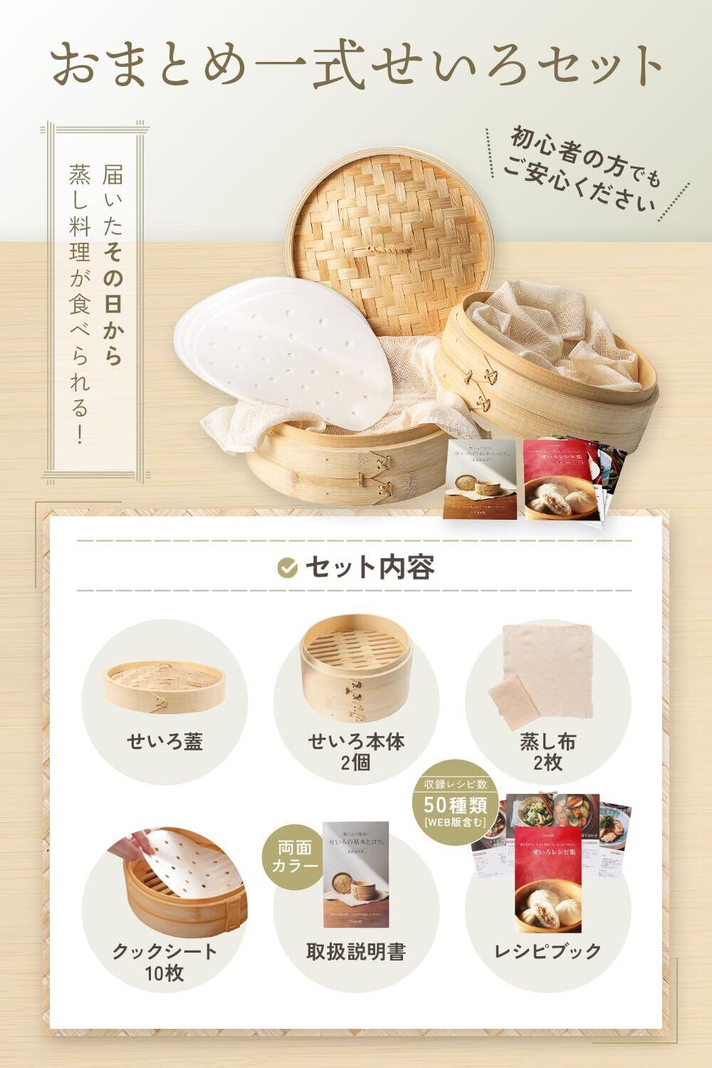 【充実セット】せいろ二段・レシピ集・蒸し布・せいろ蒸しシート付き。蒸し器・せいろ調理をすぐに始められます。