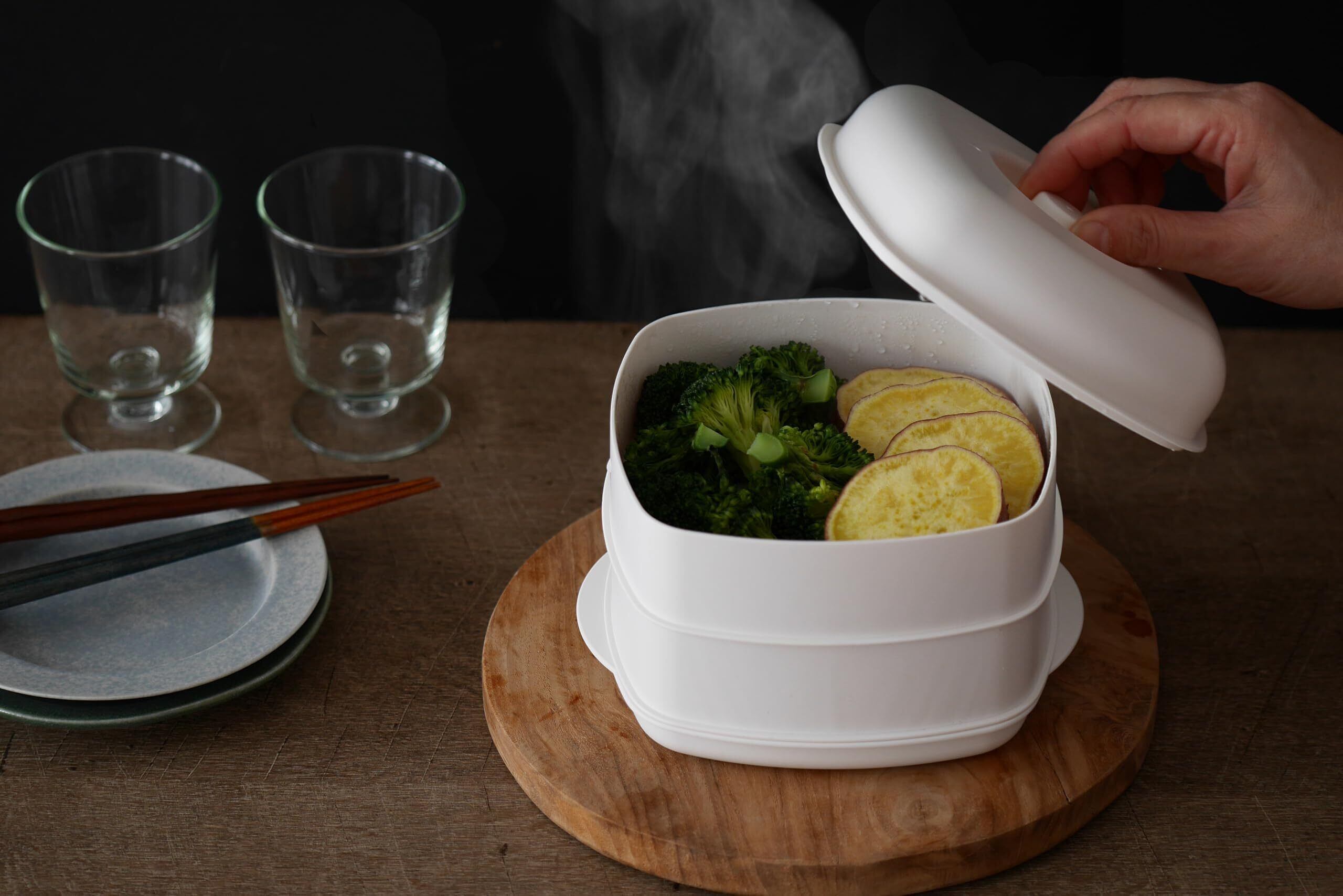 2つの食材を同時に調理できる電子レンジ用せいろです。