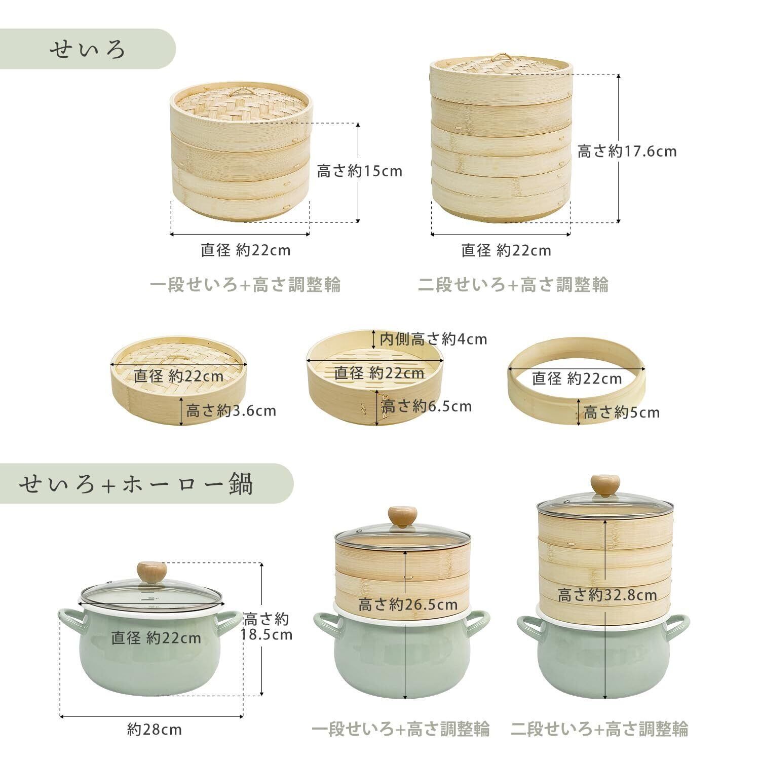 【セット内容】 「せいろ」①フタ 1点 ②本体1段 or 2段 ③高さ調整輪 1点 ④せいろ用キッチンブラシ 1点 ⑤マグネットフック 4点 ⑥蒸し紙 50枚 「ホーロー鍋」①フタ 1点 ②鍋本体 1点 ③油温度計 1点 ④揚げ物網 1点 ⑤持ち手用断熱グリップ 2点