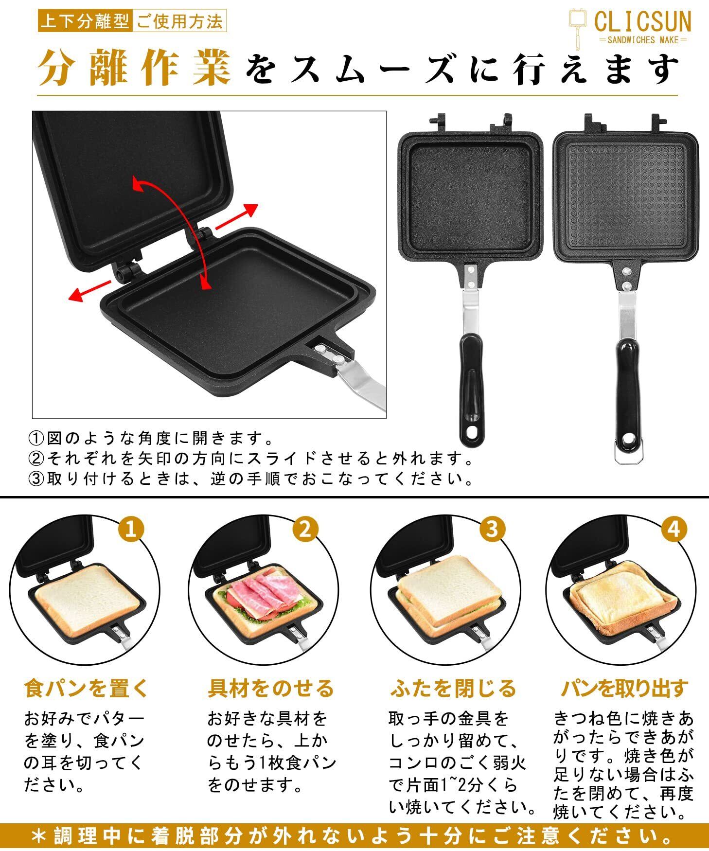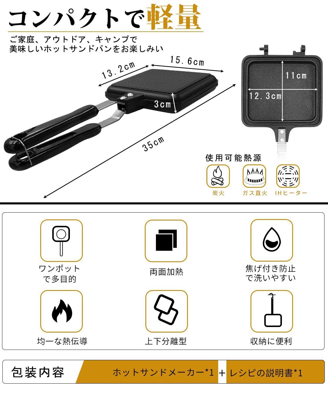 ホットサンドメーカー 直火 IH対応 ホットサンドイッチクッカー ホットサンドトースター レシピ付 両面焼き 着脱式 ロック付き フッ素加工 両面フラット キャンプ アウトドア 家庭用 耳圧着 ブラック