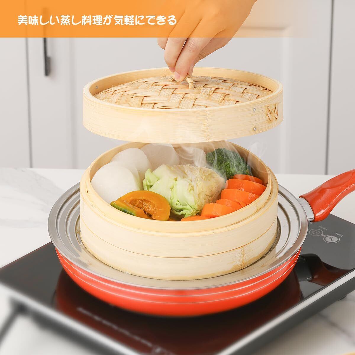 【3段階段】せいろ 受け台は階段状のデザインで、直径20-24-27cmの鍋に対応しており、適用範囲が広がります。ストックポット、中華鍋、フライパン、ミルクパン、電気調理器、キャセロールなどさまざまなタイプの鍋に適応します。(※蒸し板の表面には青い保護フィルムが貼ってありますので、ご使用前に端から剥がしてください。)