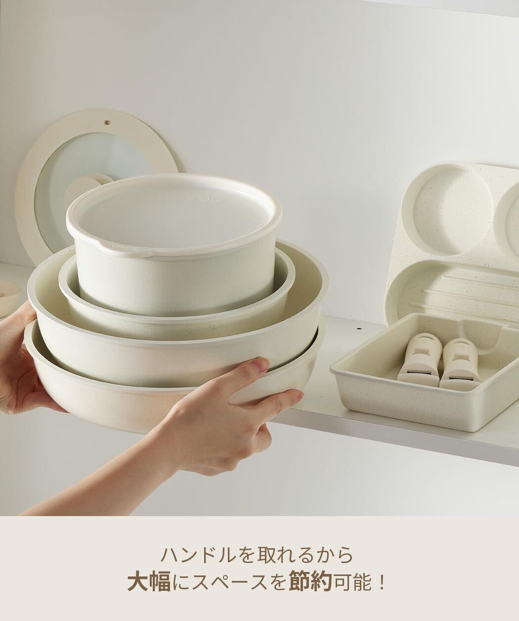 【着脱式専用取っ手】簡単に取り外せる専用取っ手、いろんなシーンに合わせて便利に使えます。取っ手が邪魔にならないため、スペースが限られた場所にも収納できます。調理後は、鍋敷きを置いた食卓に出すことも可能です