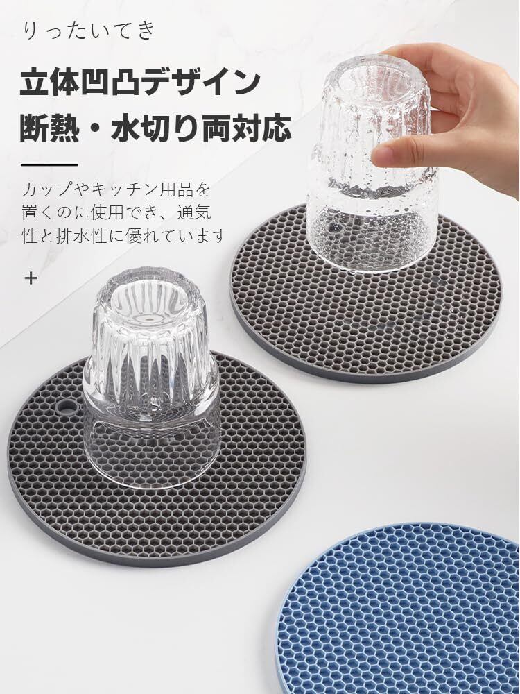 【多機能】ただの鍋敷きとしてだけでなく、さまざまな用途で役立つ多機能性を備えています。コースターとしての使用が可能で、安定して置けるため、飲み物を楽しむ際の安心感が増します。折り畳むことによって、鍋つかみとしても使用することが可能で、滑りにくい素材は、高温の鍋やフライパンをつかむ際にもしっかりとグリップし、手を熱から保護します。