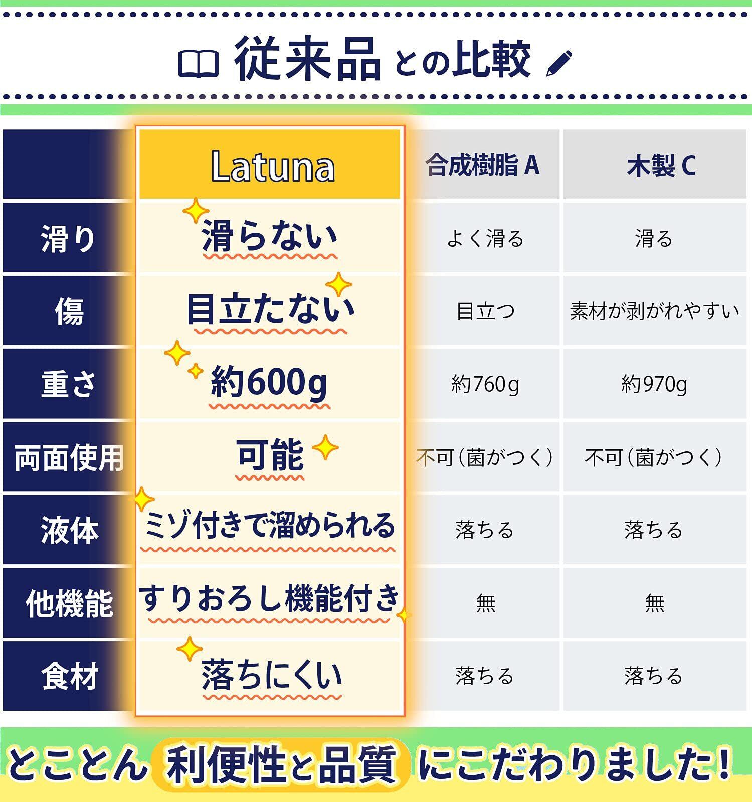 【世界各国の衛生基準突破】有害物質なし!細菌なし!化合物無し!の3拍子。このご時世だから気になる衛生面をとことん追求しました。一般的なまな板は使っていくうちに傷が目立ちそこに菌が入りがち…しかしLatunaのまな板は、表面も傷が付きにくく色が移りにくい素材を採用。万が一の際は、漂白もできるのでいつでも清潔状態を保つことができます。※まな板表面に黒色や黄色が混ざることがありますが、汚れではありません。麦を使用しています(そのためアレルギー体質に方はご注意ください)