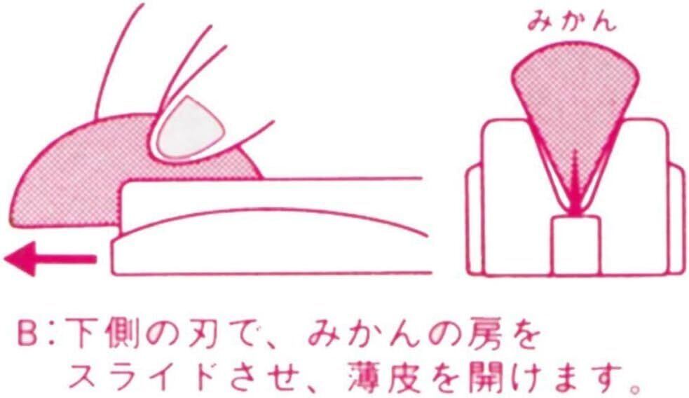 ●ピンクの上フタのとがった部分でみかんの外皮に切れ目を入れる、あとは手でするっと取れる