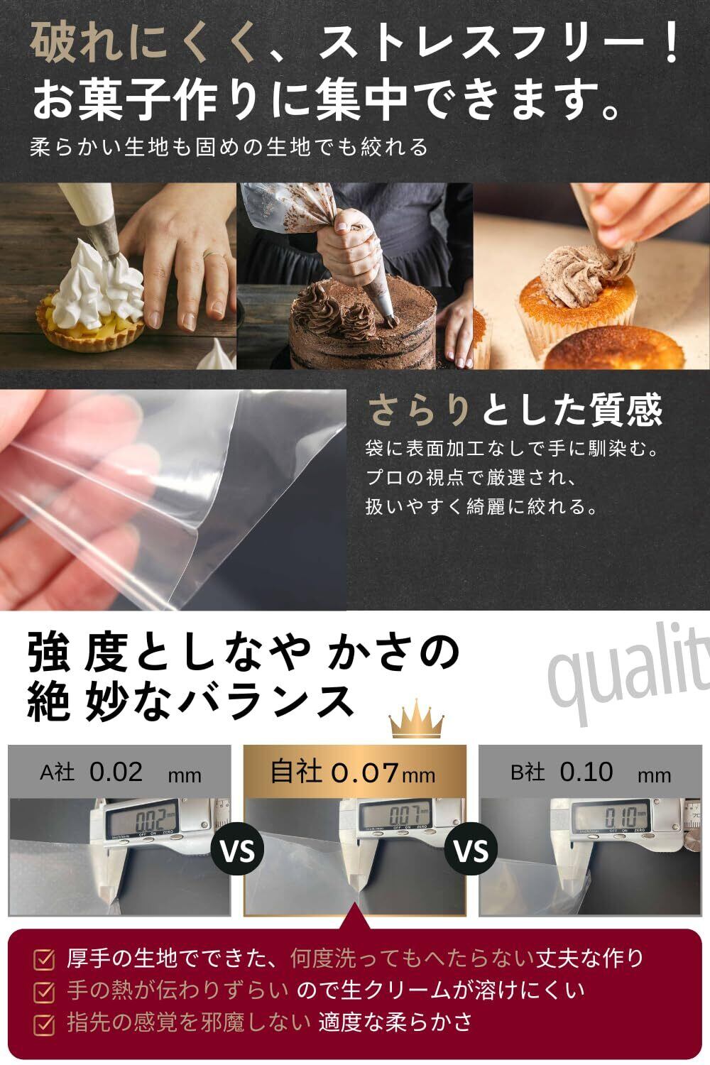【絶妙な厚み】手の熱が伝わりずらく、手先の感覚を邪魔しないちょうどいい厚みの絞り袋を厳選。