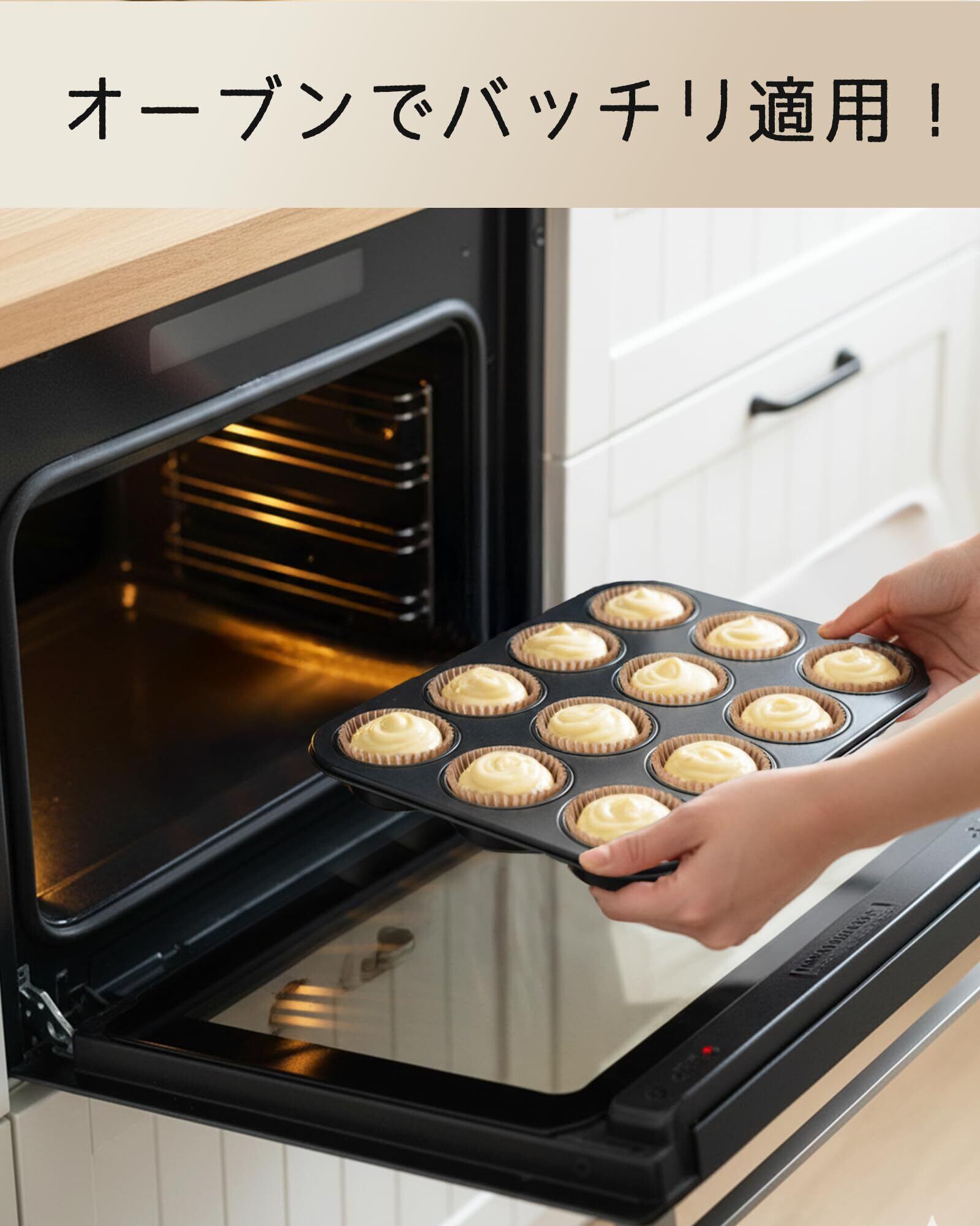 【ベーキングカップとおすすめ!】当社のベーキングカップと組み合わせることは最適。下処理の時間を節約できる。型からスッポリに取り出せる。友人と楽しむのにも便利で、使用後のお手入れも簡単です。