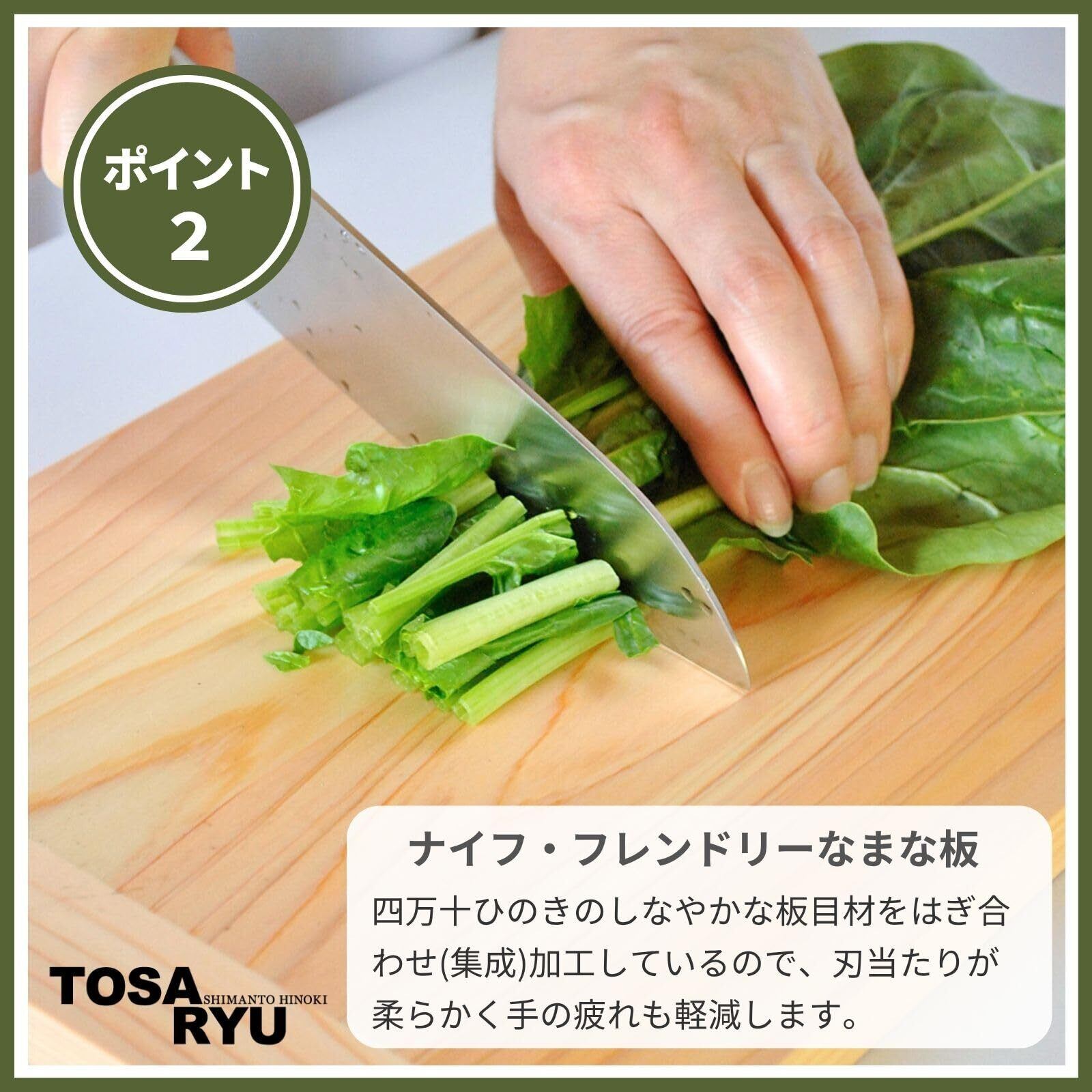 弾力に富んだしなやかな四万十ひのきの板目材を集成(はぎ合わせ)加工しているので、刃当たりが柔らかく、刃先にやさしいまな板です。