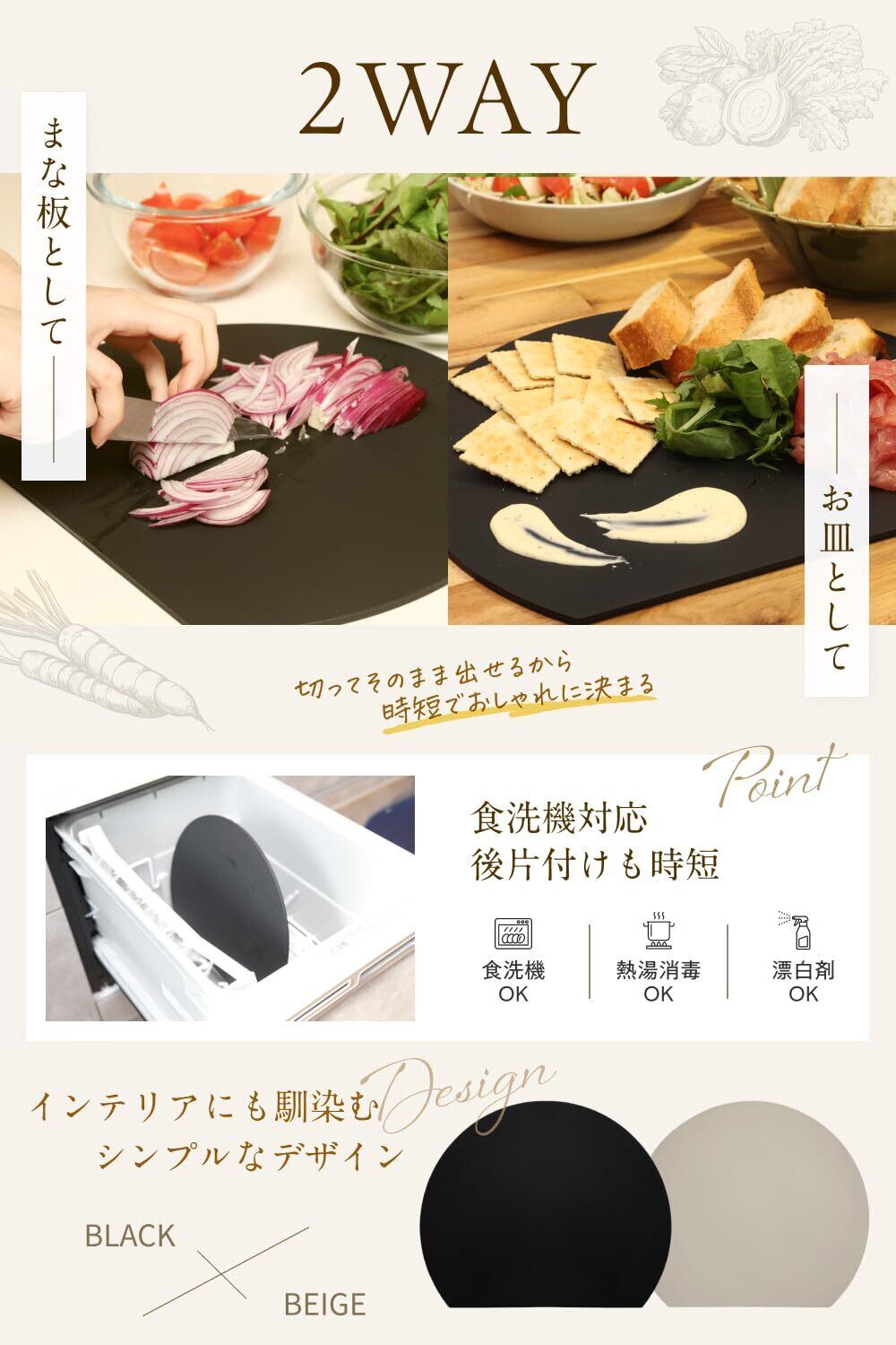 【素材・形状へのこだわり】柔軟性と耐久性に優れたエラストマー素材を採用しました。弾力性があるため切った食材を滑らせることなく使用することができます。形状はまな板の奥行を有効活用できるD型にカッティングしているため、キッチンの作業スペースを有効活用することができ調理効率を高められるためとても便利です。