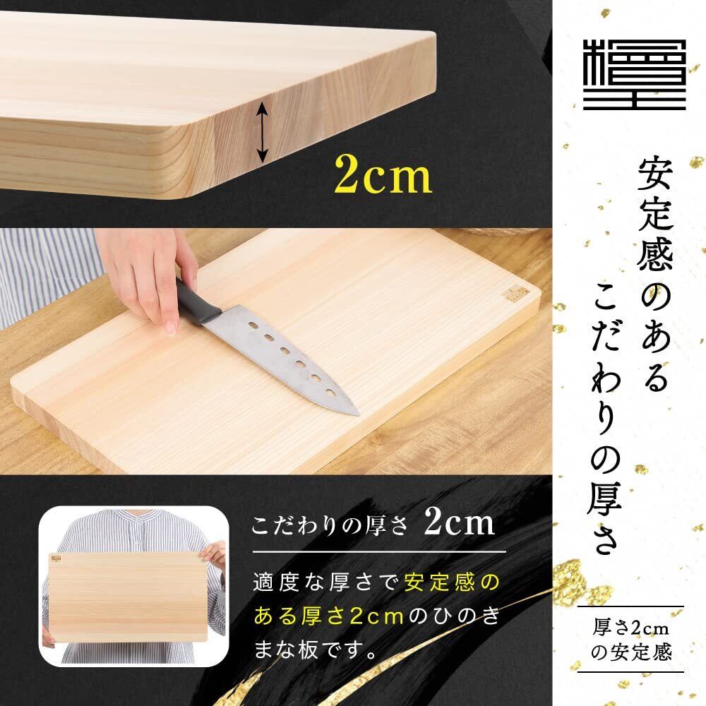 【特長】 ・適度な厚さで安定感のある厚さ2cmのひのきまな板。 ・側面にシリコン塗装を施していますので、乾きが早く、黒ズミを抑えます。 ・反りを抑える「反り防止加工」を施しています。