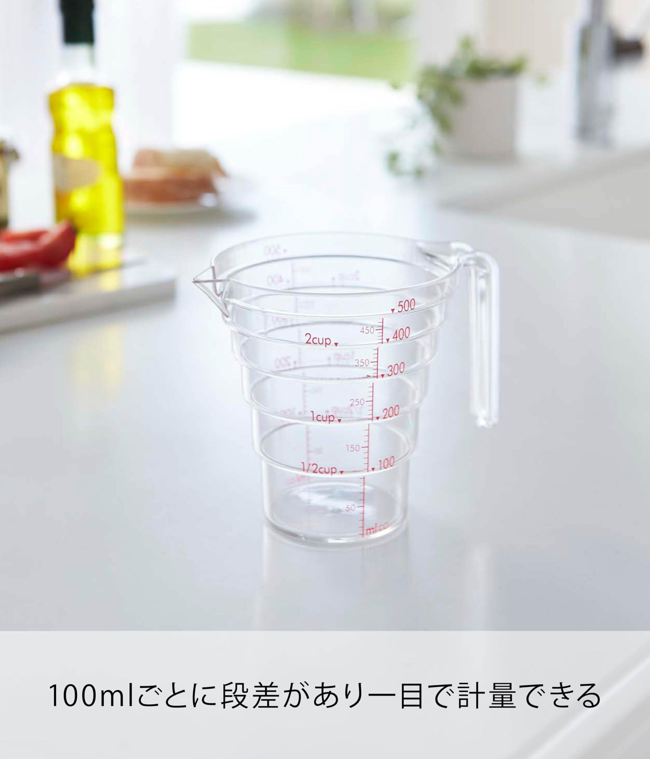 ●段差メモリで上から一目で簡単計量。熱に強く割れにくいトライタン樹脂製。200mlと500mlをスタッキングして収納できます