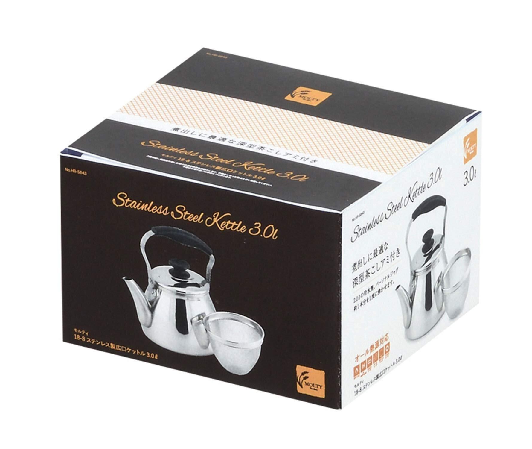 ○お茶の煮出しに便利な、深型の茶こしアミが付いたステンレス製ケトル(やかん)です。 ○広口なので中まで洗えて衛生的です。2Lの冷水筒、パーソナルジャグ2本分を1度に沸かせる、大容量モデルのケトルです。 ○ガス火はもちろん、200VのIHクッキングヒーターやハロゲンヒーターなどオール熱源に対応しています。