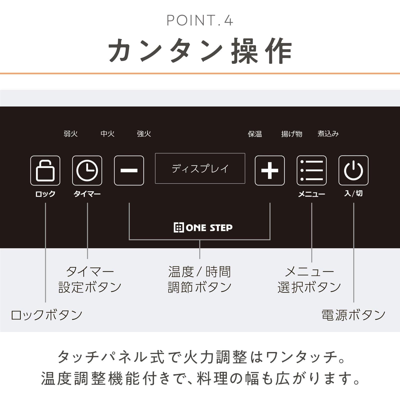 【操作はシンプルに】タッチパネル式で火力調整はワンタッチ、温度調整機能付きで、料理の幅も広がります。
