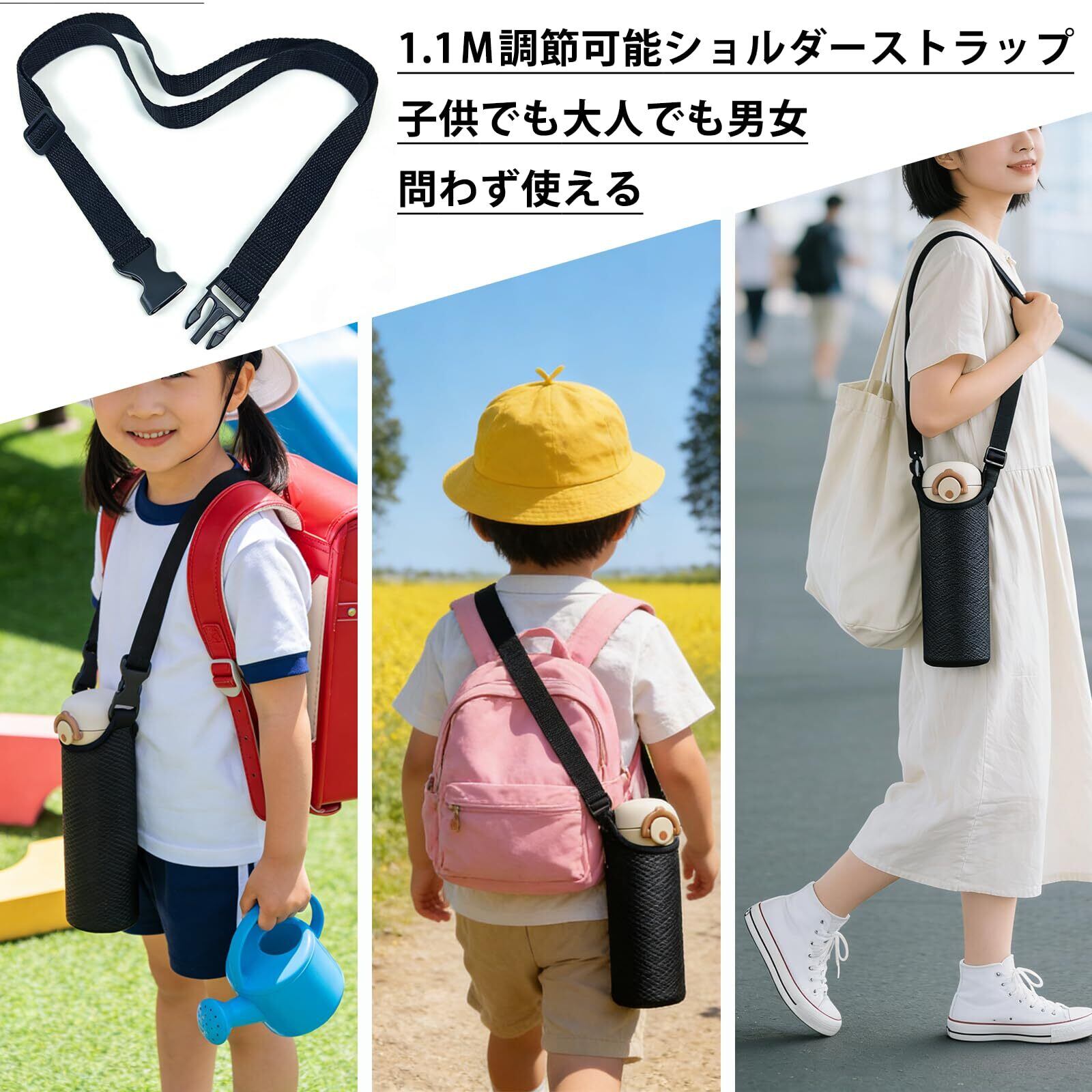 1.1m調節可能ストラップ 大人から子供までフィット<ー> ショルダーストラップの長さを最大1.1mまで調節可能。 大人の肩掛けから子供の身長に合わせた長さまで、家族みんなで使える便利設計です。