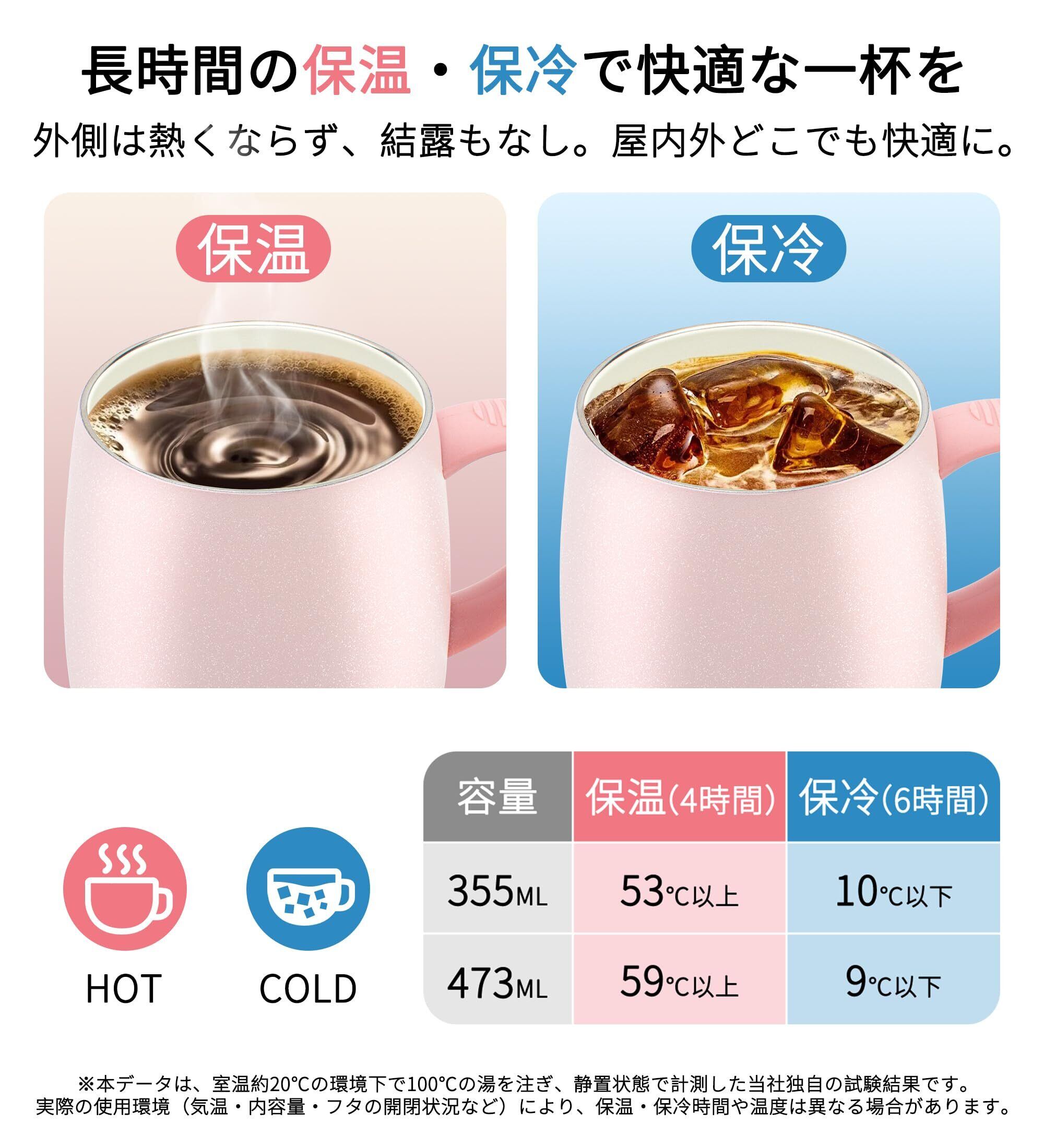 二重構造設計・優れた保温保冷力:セラミックコーティングを施した高品質マグカップと外ステンレスの二重断熱構造により、温かい飲み物は約6時間、冷たい飲み物は約12時間しっかり保温・保冷。セラミックコーティングによって、飲み物本来の香りや味わいを逃さず、金属臭のない自然な飲み心地を実現します。結露しにくく、外側が熱くならない快適設計で、季節を問わずホットもアイスも楽しめるマグカップです。