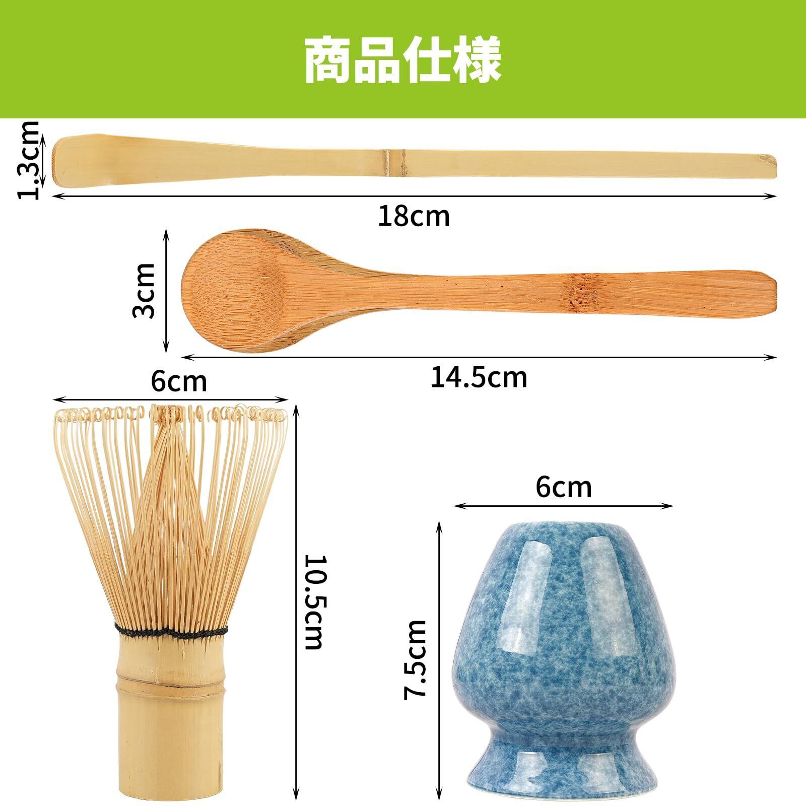 【商品仕様】梱包サイズ:約7.5x7.5x20cm。梱包重量:約0.23kg。セット内容:茶筅(百本立)×1、茶筅立て×1、茶杓×1、茶さじ×1。