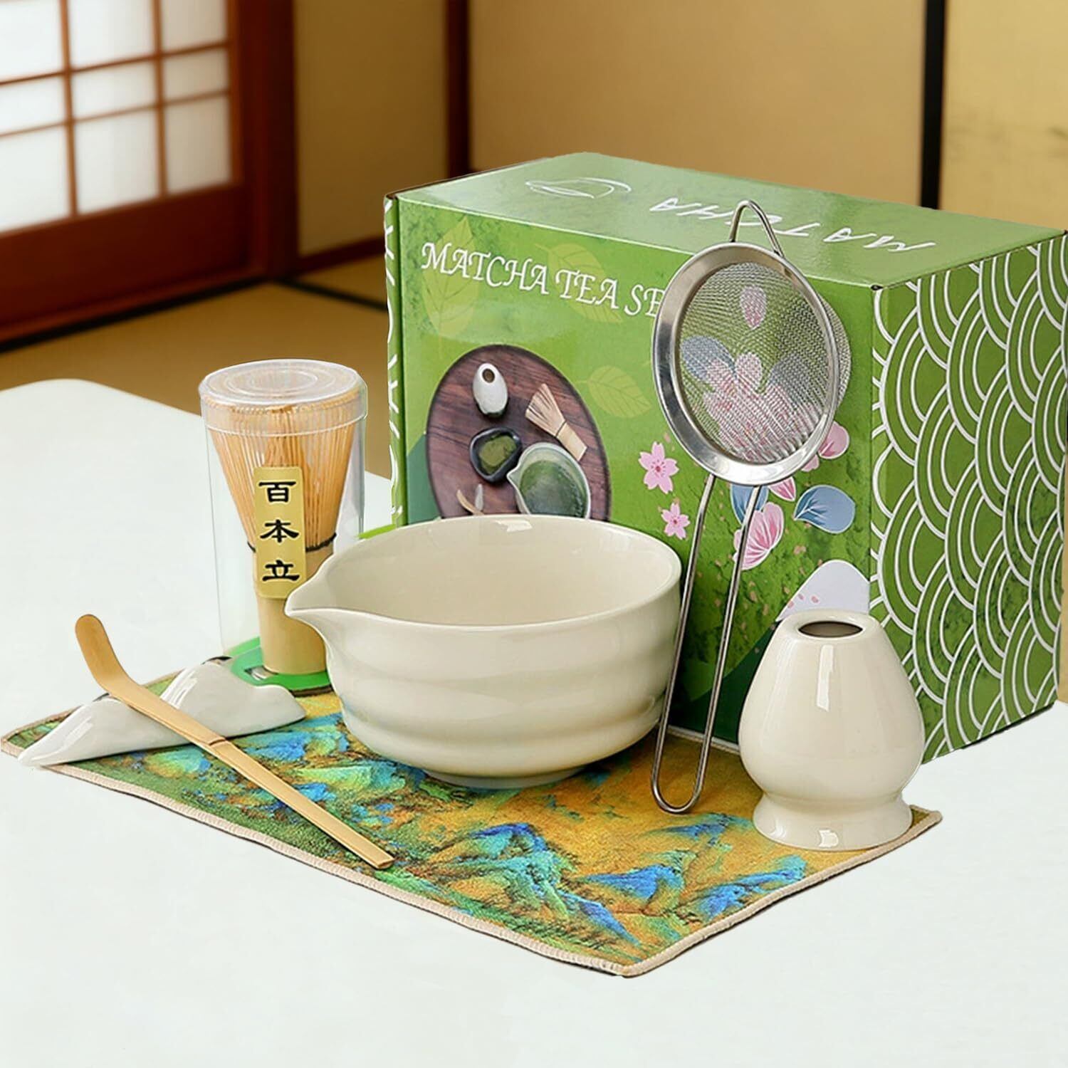 【7点フルセット・届いてすぐに使用可能】 抹茶碗、茶筅、茶杓、茶筅立て、茶巾、茶こし、茶漉しの7点セット。届いたその日から本格的なお点前体験が可能です。自宅での点前体験などに使用できます。