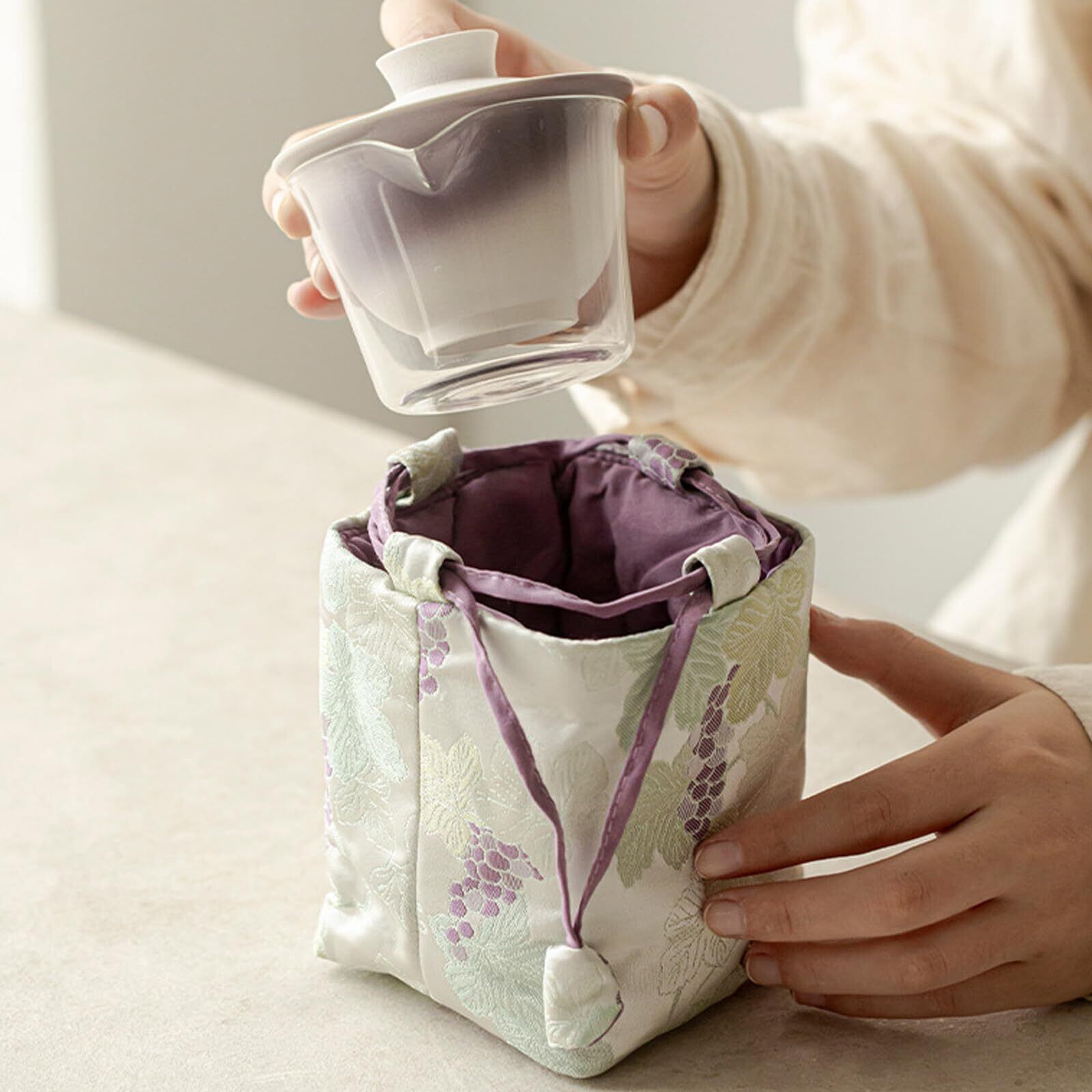 【デザイン特徴】紫色のグラデーションが美しい陶器と、葡萄柄が施された布包みの調和の取れた茶器セット