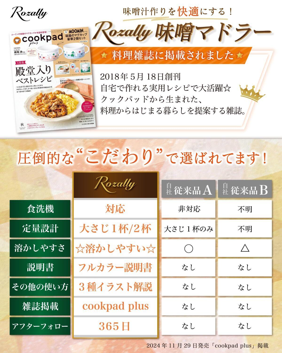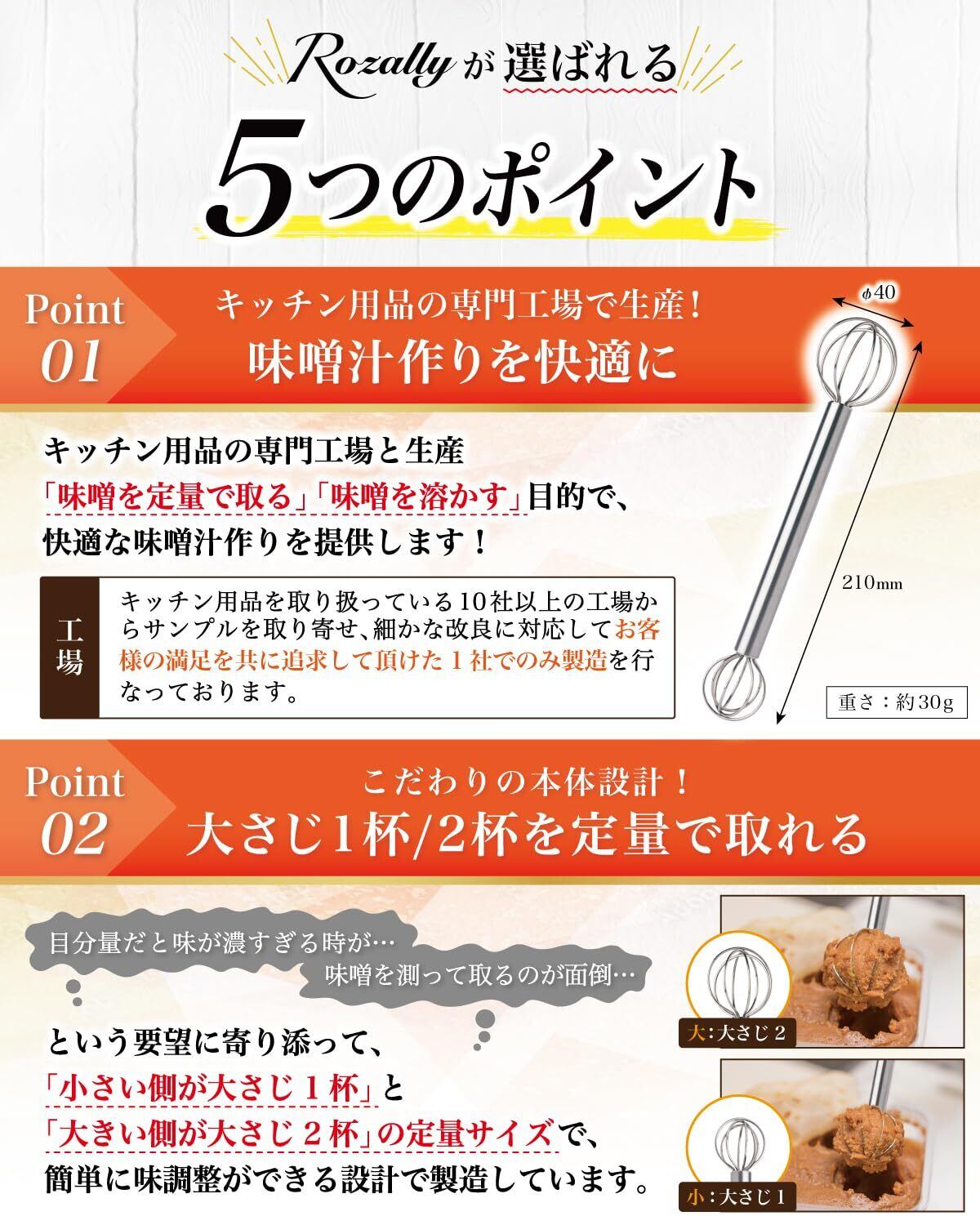 【こだわり】 様々なメーカーから キッチン 用品として” 計量味噌マドラー ”や” みそ計量器 ”として みそマドラー が販売されていますが、 Rozallyの 味噌マドラー は”こだわり”が一味違います。 「小さい側:大さじ1杯」「大きい側:大さじ2杯」の設計で、 「1人暮らし」~「2人/3人分」の味噌を簡単に取ることができます。 また味噌マドラー本体は食洗機対応なので、”水洗い”もラクラクです。