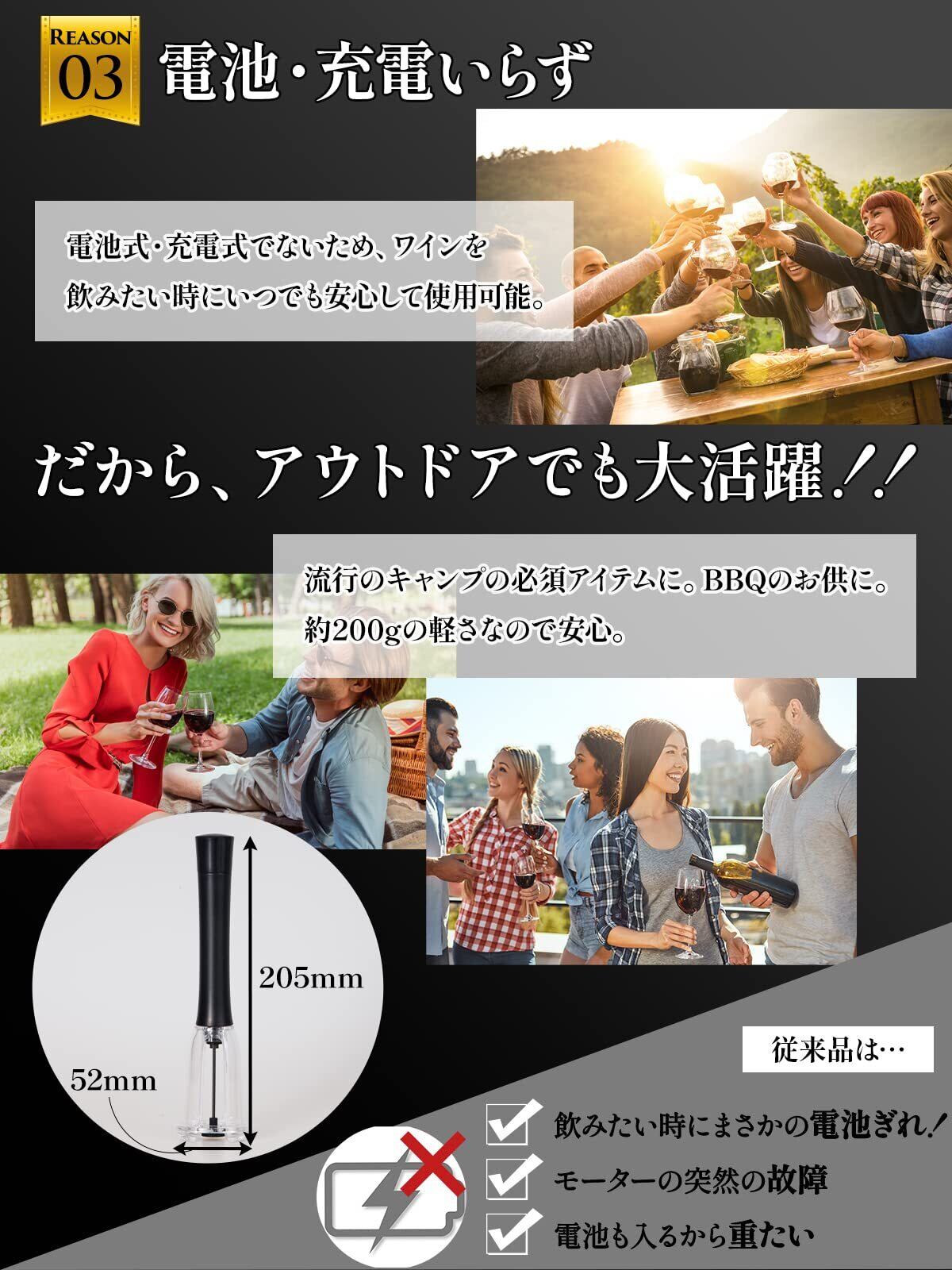 ⑤【電池不要・充電不要】 電動 ではないため電池も充電も不要。BBQやキャンプでいざワインを開けようと思ったときに電池がないという心配もない。モーターの故障の心配もゼロ。