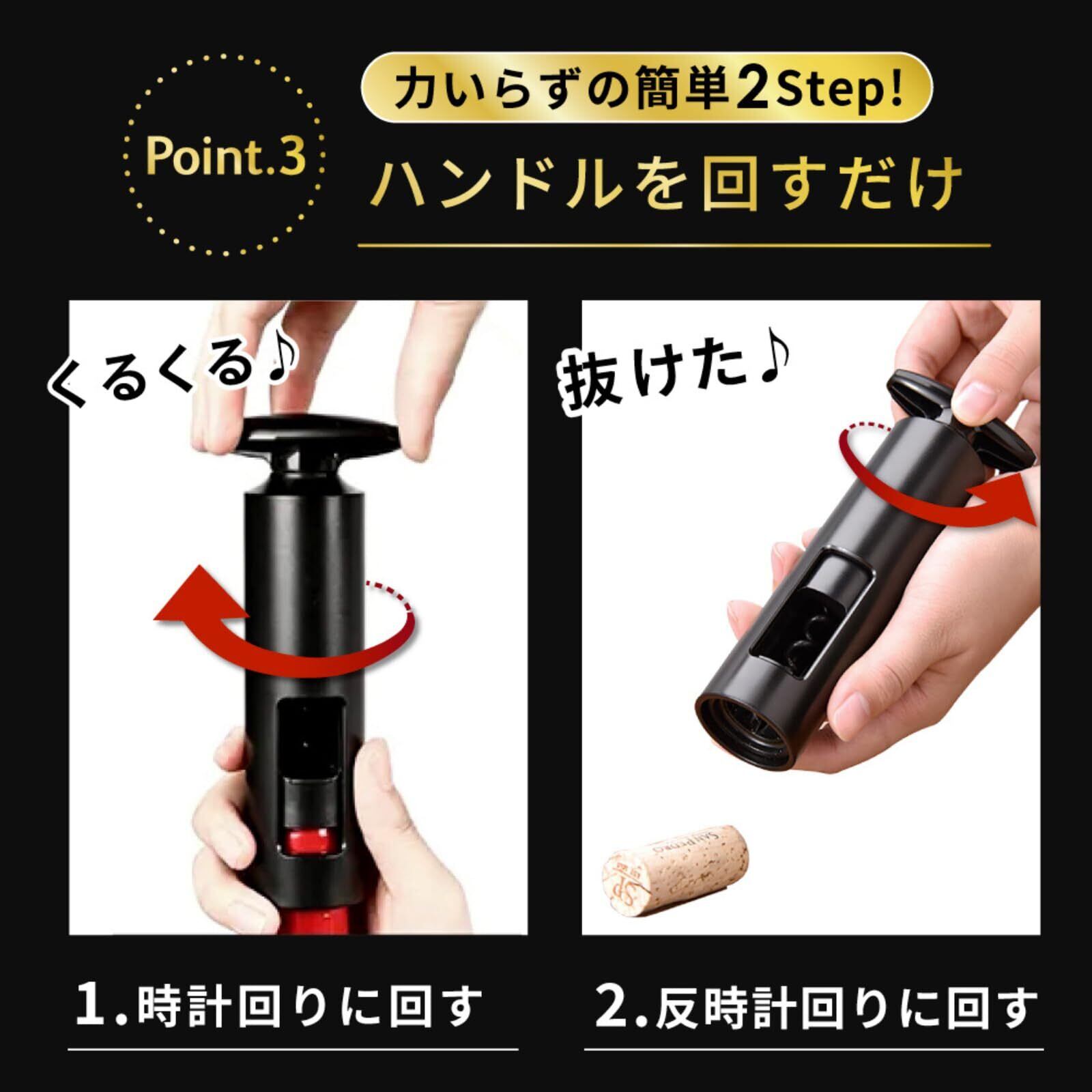 【充実の3点セットでコスパ抜群】 ワインオープナーに加えて、フォイルカッター、日本語取扱説明書がすべて付属。基本機能が揃っているので、届いたその日からすぐに使えます。これからワインを楽しみたい方へのギフトにもおすすめです。