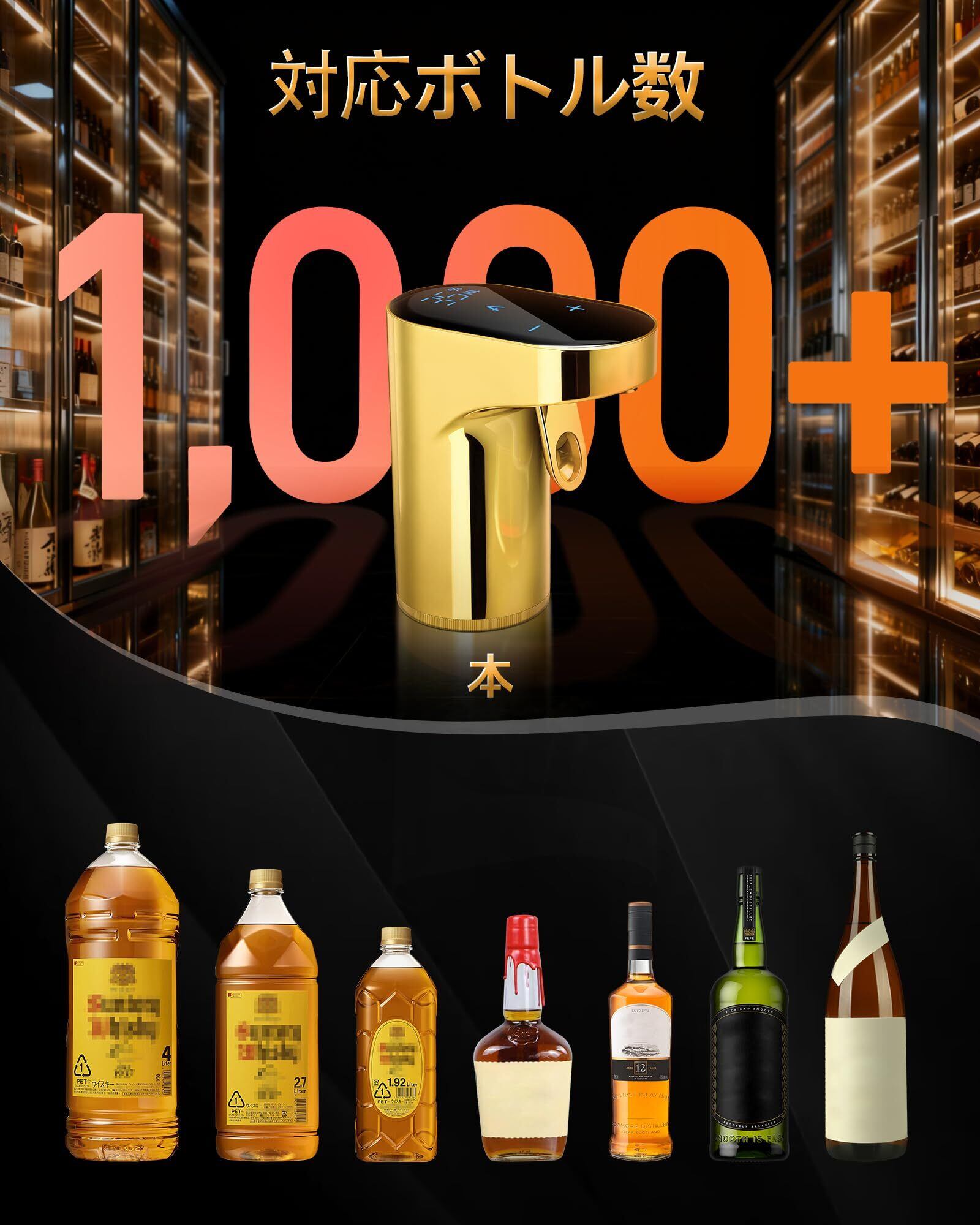 ボトルのサイズが合うか心配?本品は幅広いボトルに対応可能。3種類のアダプター(18mm-20mm、21mm-23mm、28mm-30mm)と伸縮可能なチューブが付属し、ボトルの高さ165mmから385mmまで適合します。この電動ウイスキーポンプは、ウイスキー、ワイン、清酒、焼酎などにお使いいただけます(炭酸飲料やシロップ状の飲料には非推奨)。