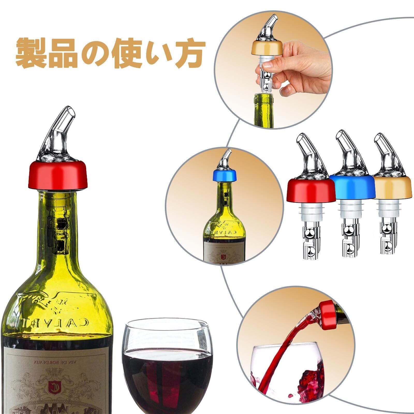 【セット内容】金色の注ぎ口(45ml)×3個。製品高さ9.5cm。ボトルの口径が2〜2.2cmのワインボトルや他のボトルに適用。取り外しと交換が容易で、石鹸水で手洗いして再利用できます。簡単で便利。
