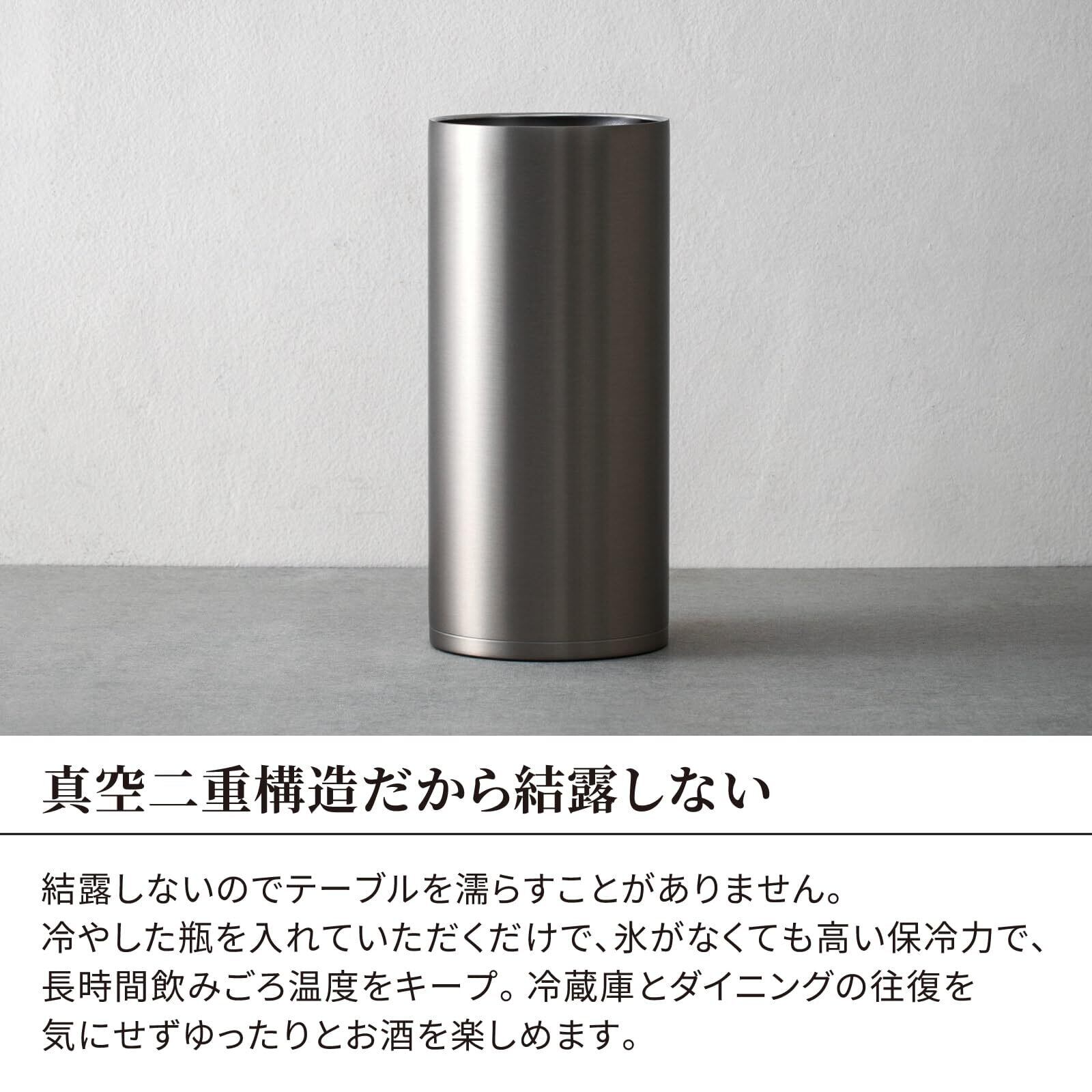 【ステンレス真空二重構造】:魔法瓶構造でしっかり保冷して飲みごろ温度をしっかりキープします。結露などで卓上を濡らしにくいのもうれしいポイントです。【4合瓶対応のサイズ】:一般的に多く販売されていて冷蔵庫などでも冷やしやすい、4合瓶(720ml)に対応したサイズです。電気が不要で、冷やした瓶ごと差して卓上でご使用できます。1Lのペットボトルにも使用でいるので晩酌時以外にもご利用いただけます。【シンプルで飾らないデザイン】:ステンレス地をいかしたシルバー柄でリビングやダイニングに置きやすいデザインです。【イベントで活躍】:ホームパーティや大人数での食事会などにもピッタリです。【贈り物として】:冷酒だけでなくワインクーラーやペットボトル飲料にもマルチに使えるので、誕生日や記念日のプレゼントとしても最適です。