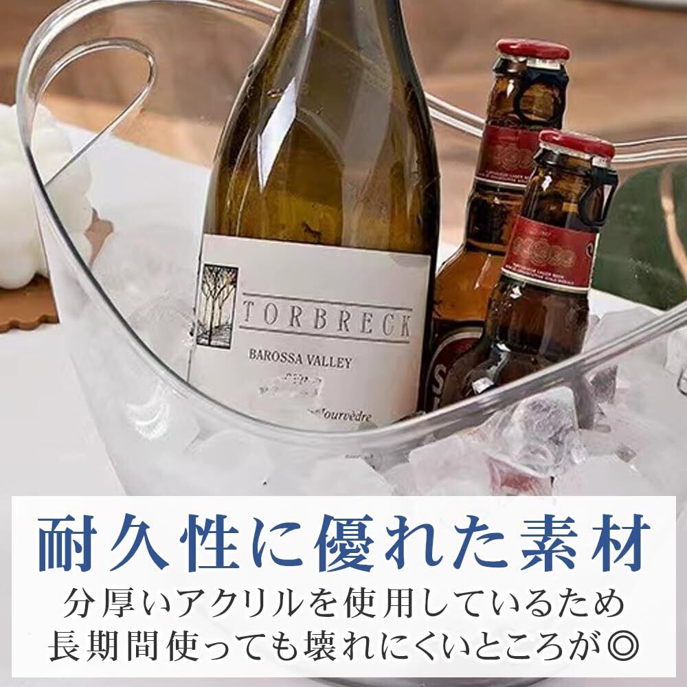 素材には厚みのあるアクリル製を使用しているので、割れにくく重い物も入れられます。両サイドは指を引っ掛けて持ち歩ける持ち手を完備。ワイン・シャンパン・ビール・ジュースなどのドリンクを冷やす際にお勧めです。