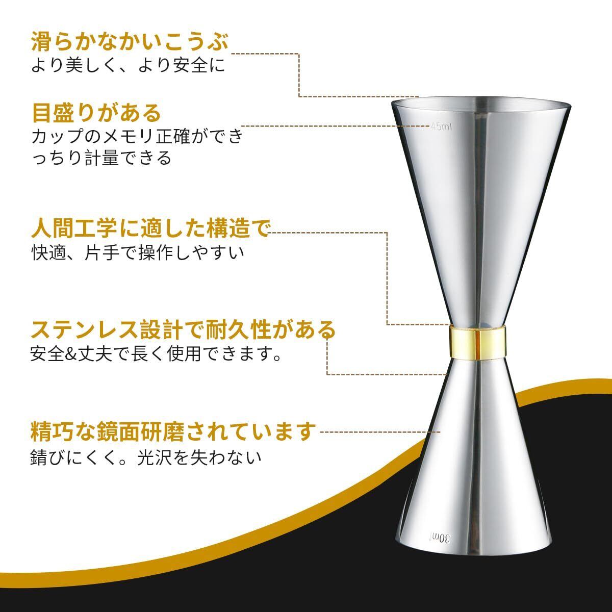 【ジガーカップ】ダブル計量カップ一体型デザインで、小さなヘッド30mlで満たされ、内部の目盛りは10ml、20mlです;大きなカップは45mlで満たされ、内部の目盛りは15ml、30mlです。目盛りの線と数字が見やすいため、正確な測定もされます。ジン、ウォッカ、ラム、ウィスキーを正確に量り、楽しく酒を飲みます