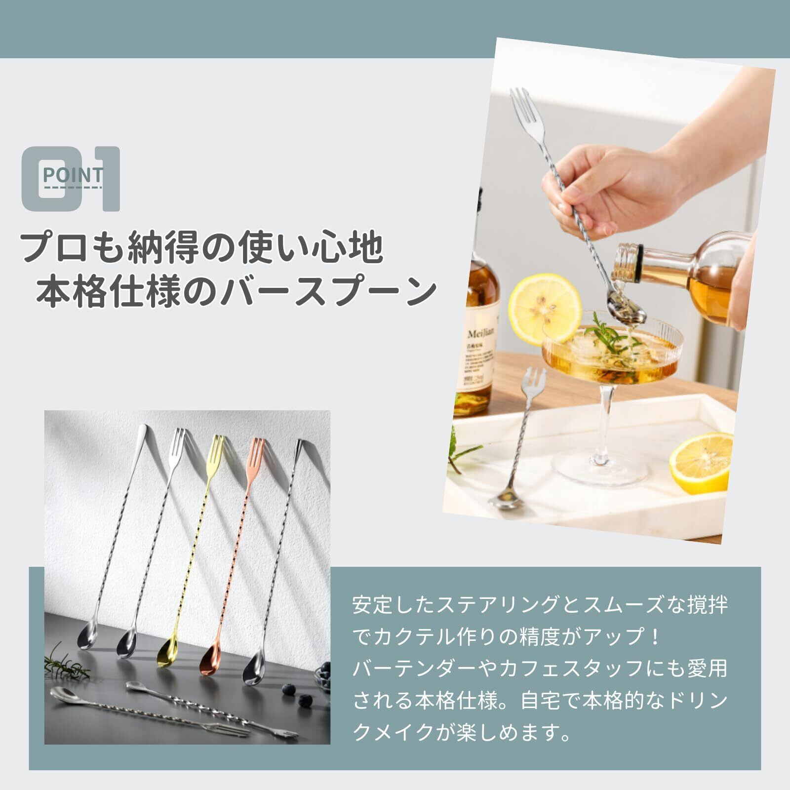 【多機能なフォークエンド】スプーンの反対側には便利なフォーク付き。カクテルのトッピング用フルーツのピックアップや、ミントの軽いマッシング、オリーブの取り出しなど多目的に使えます。撹拌だけでなく、サーブや下ごしらえにも活躍する実用的な設計が魅力。1本で複数の用途をカバーできるのが大きな特徴です。