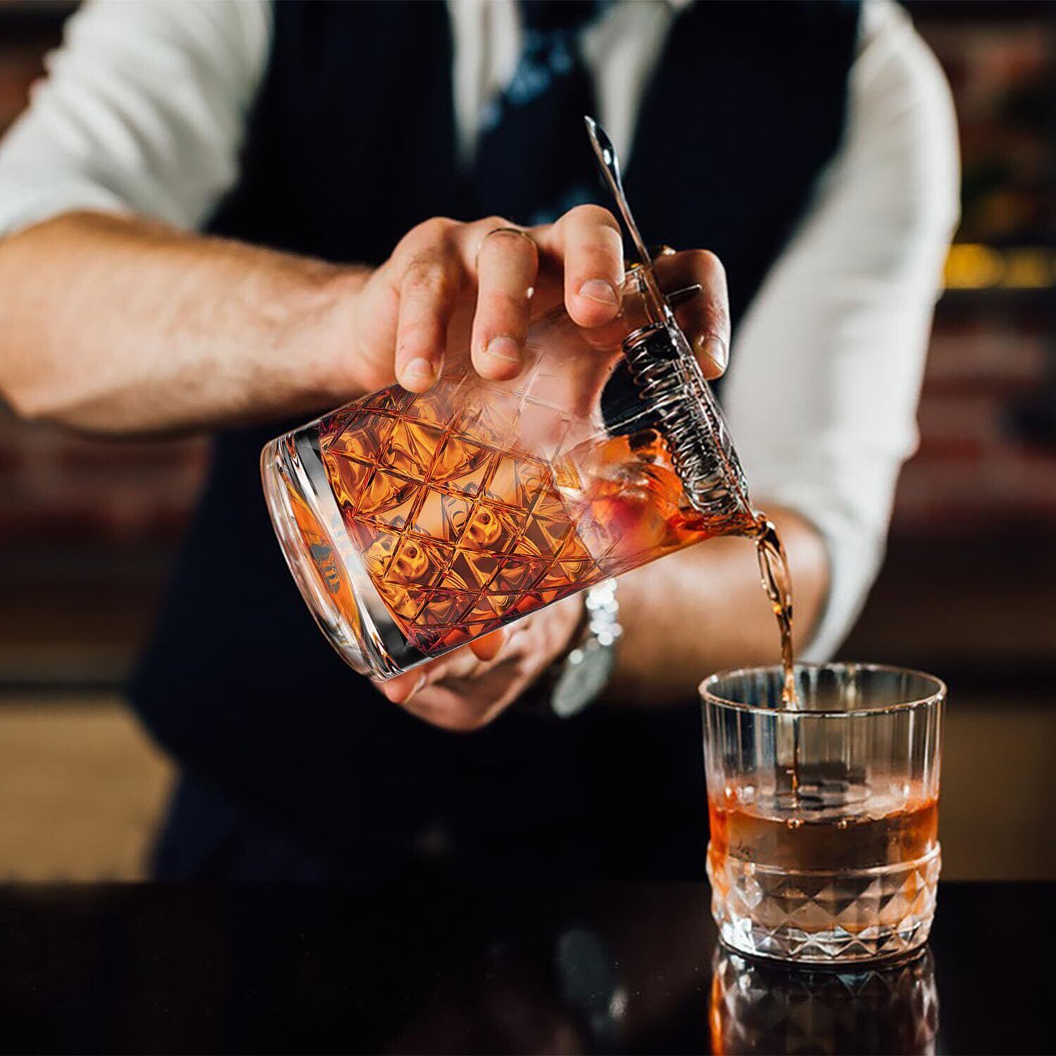 ユニークなダイヤモンドパターンのデザイン:ユニークなエッチングダイヤモンドパターンで区別され、ミキシンググラスはご自宅のバーやバーカートに美しく見えます。グラスのユニークなダイヤモンドパターンは、かき混ぜる際にミキシングチップをつかむのに役立ち、グラスの滑りを防ぎ、ある程度の安全性を確保する。ミックスグラスの底が厚いため、安定性とバランスが向上し、バーテンダーとしての経験が深まる。