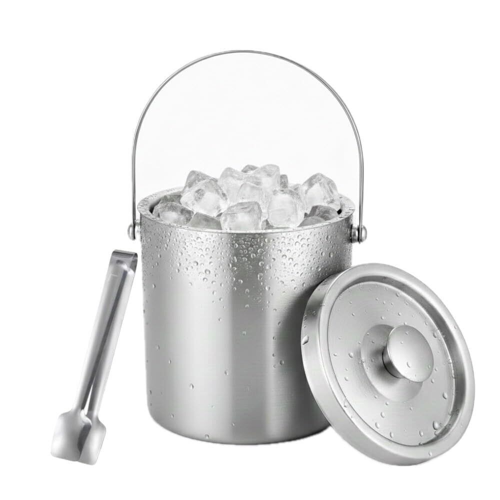 【溶けにくい二重構造】 アイスペールは、中空二重層設計により氷が溶けにくく、冷たさを長時間保持できます。 トング、ハンドルとフタが付いており、持ち運びや使用後の保管も便利です。
