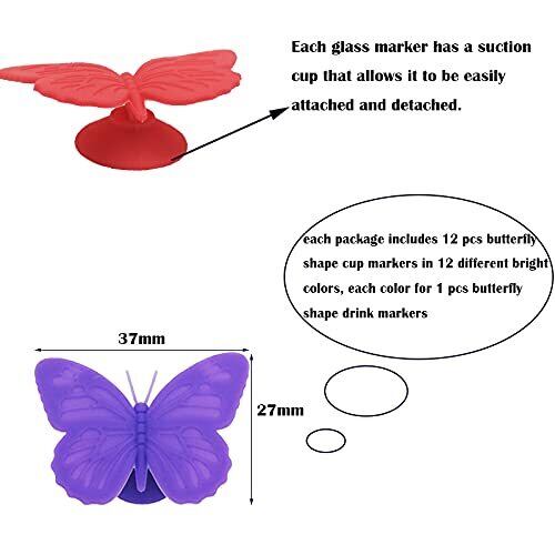 パッケージ:各パッケージには、12の異なる明るい色の12個のバタフライシェイプカップマーカー、1個のバタフライシェイプドリンクマーカーの各色、およびカップマーカーの損傷を防ぐための透明なプラスチックボックスが含まれています