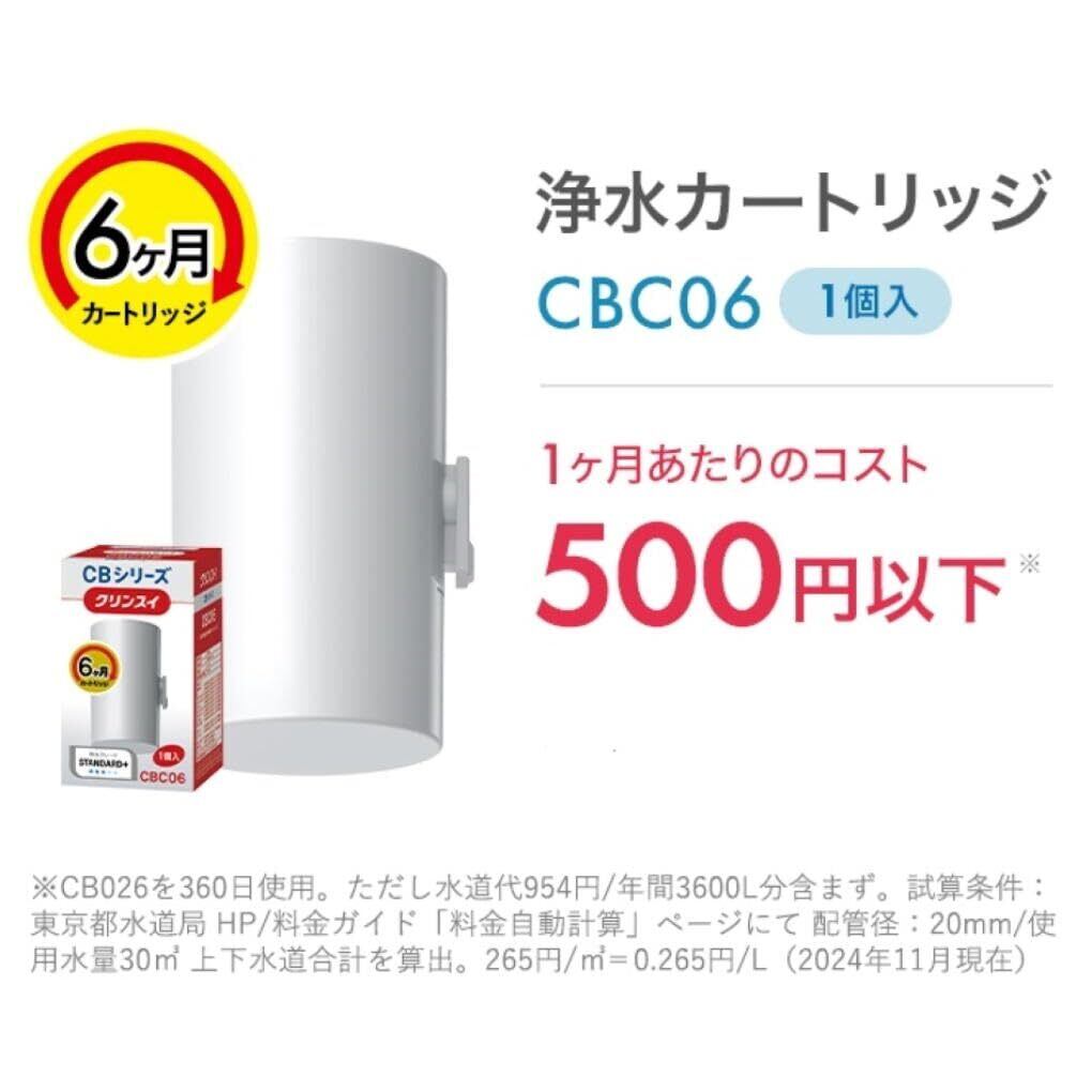 ■約500円/月で使える高コスパモデル ※浄水カートリッジ「CBC06」を3,000円(税込)とし、180日使用した場合。水道料金は含まず