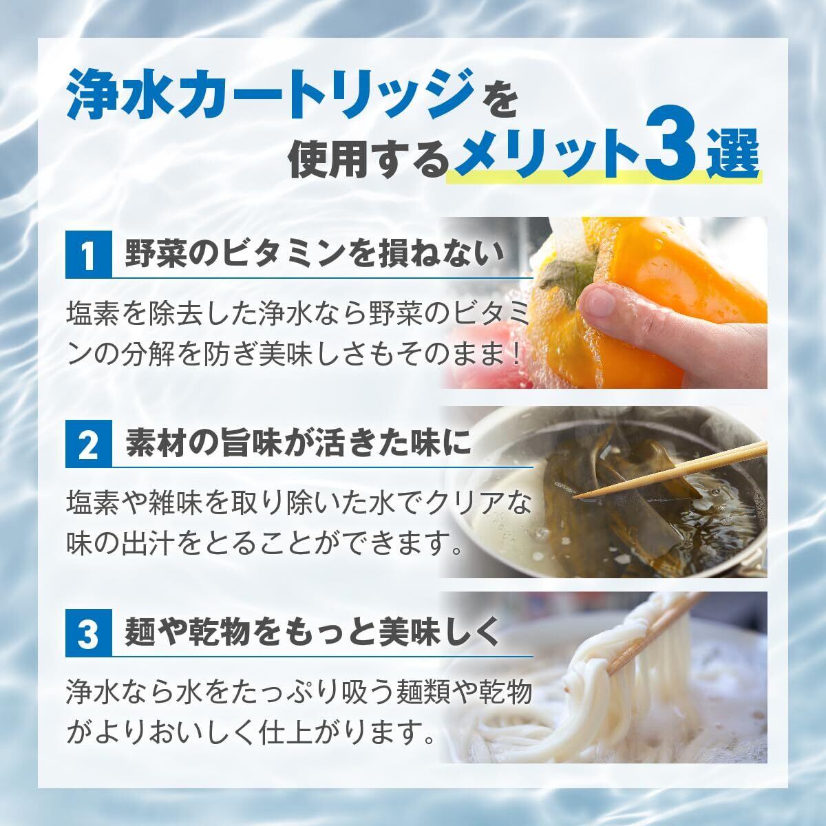 【浄水カートリッジのメリット】不要な成分はろ過しつつミネラル分はそのまま通過させるため、水本来のおいしさを引き出すことができます。塩素を除去した浄水であれば野菜や果物を水洗いした際にビタミンを損ねません。素材の旨味も引き出してくれるため、美味しい出汁を取りたいときにも重宝します。さらに乾物を戻す際や麺類を茹でる際にもオススメ!そのまま飲料水としてもお飲みいただけます。