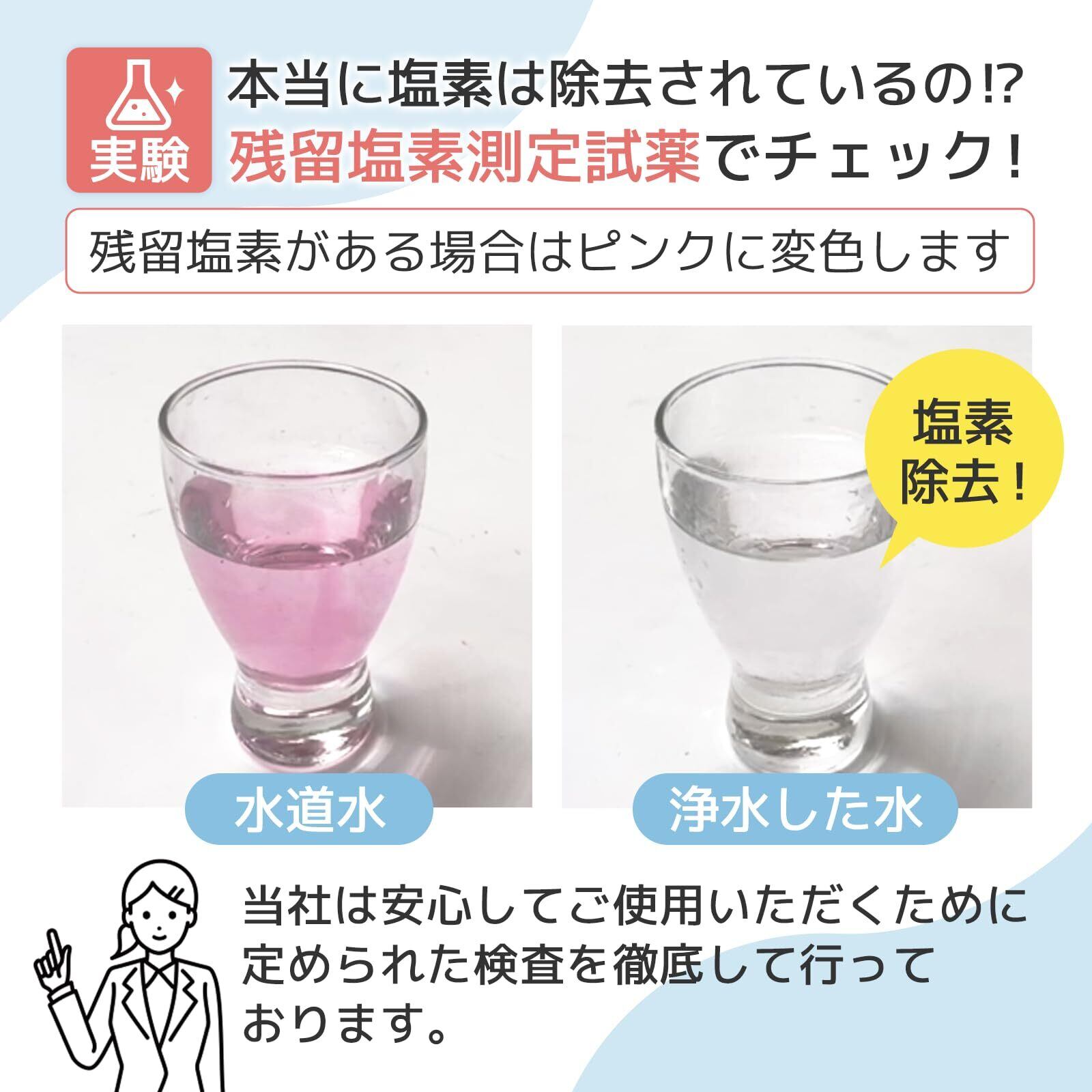 浄水能力: 7物質除去。(遊離残留塩素、CAT、2-MIBカビ臭、溶解性鉛、フェノール類、ジェオスミン、陰イオン界面活性剤) ろ材の種類: 中空糸膜、イオン交換繊維、活性炭、不織布。(一部パッケージには除去項目の反映、記載がございませんが、浄水能力は間違いなく試験にて7項目確認済みですのでご安心下さい。)