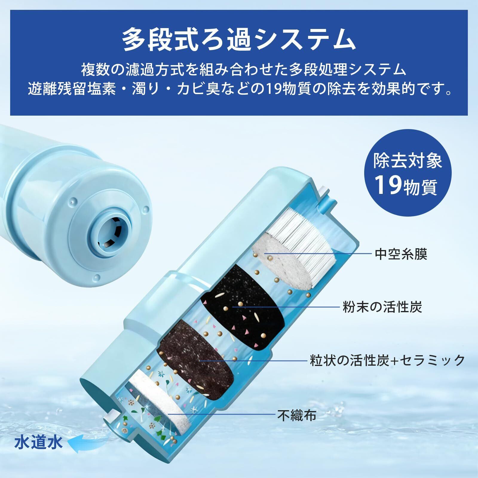 【PFOS・PFOAを含む19物質除去】遊離残留塩素、濁り、クロロホルム、ブロモジクロロメタン、ジブロモクロロメタン、ブロモホルム、テトラクロロエチレン、トリクロロエチレン、総トリハロメタン、CAT(農薬)、2-MIB(カビ臭)、溶解性鉛、1,2-DCE、ジェオスミン(カビ臭)、ベンゼン、フェノール類、PFOS及びPFOA、鉄(微粒子状)、アルミニウム(中性)