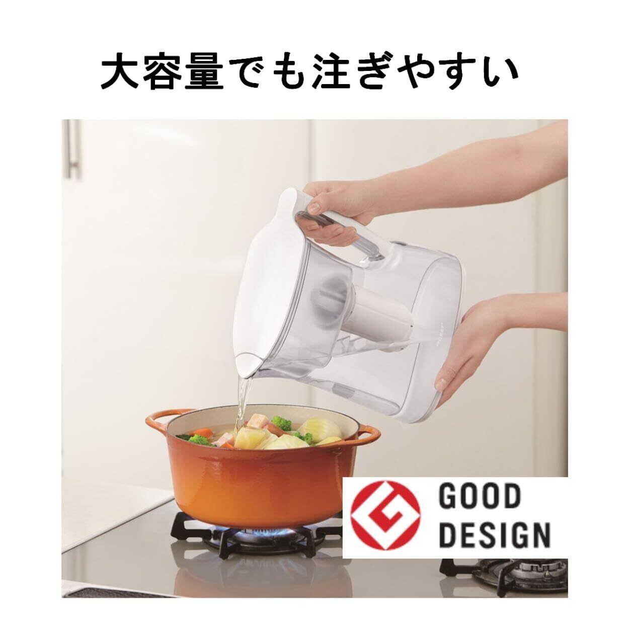 高速ろ過/時短浄水、大容量2.1L、取っ手付き、高除去タイプ、丸洗い可能、グッドデザイン賞受賞、有機フッ素化合物(PFOS/PFOA)除去