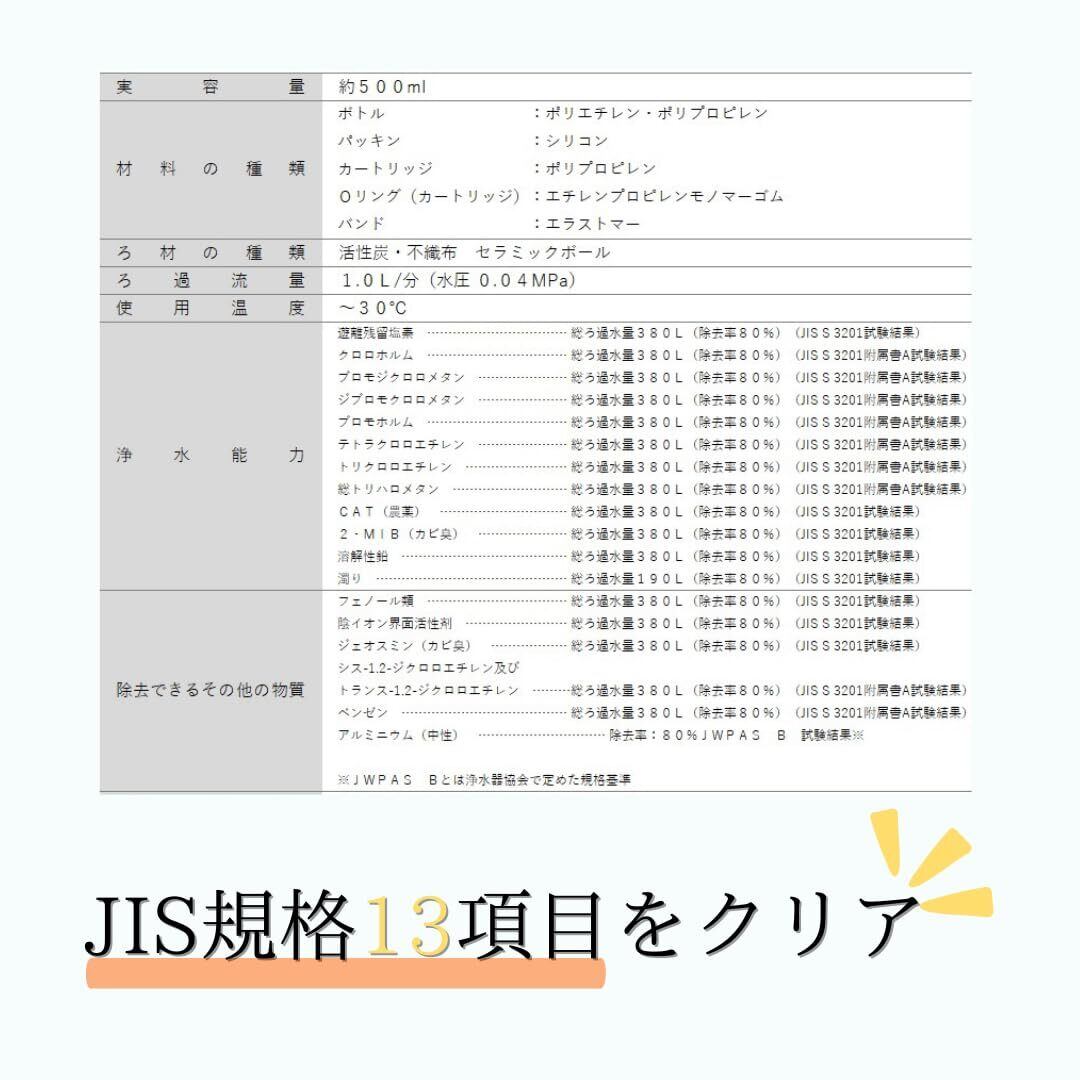 【 JIS規格13項目をクリア! 】天然素材(ココヤシのヤシ殻)から作ったマイクロ活性炭を搭載したカートリッジはJIS規格13項目をクリア。残留塩素をはじめ、身体に有害な溶解性鉛、農薬(CAT)、トリハロメタンなどの気になる物質を高いレベルでしっかり除去します。