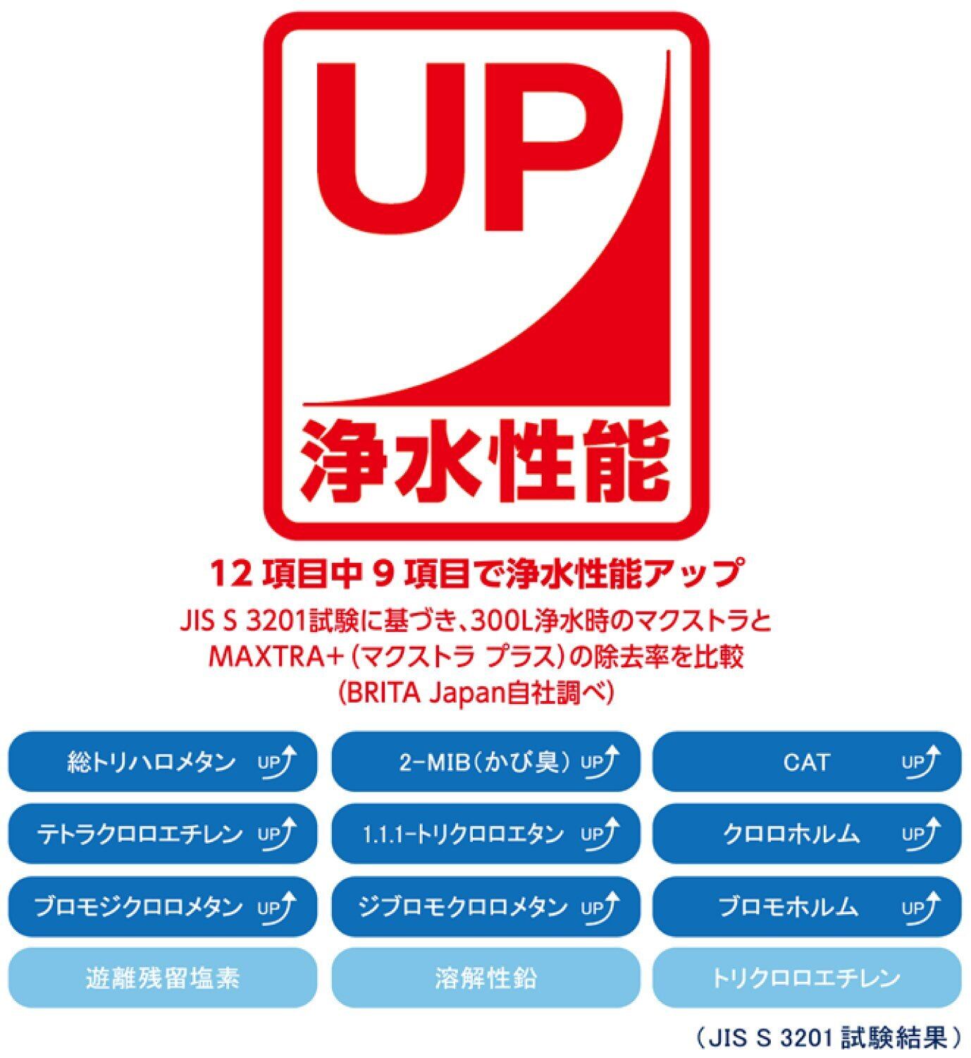 材質:ASA樹脂、メタクリルスチレン ・浄水部容量:1.4L(全体容量:2.4L) ・生産国:ドイツ ・除去物質:遊離残留塩素、CAT(農薬)、クロロホルム、溶解性鉛、テトラクロロエチレン、ブロモジクロロメタン、総トリハロメタン、トリクロロエチレン、ジブロモクロロメタン、2-MIB(かび臭)、1.1.1トリクロロエタン、プロモホルム