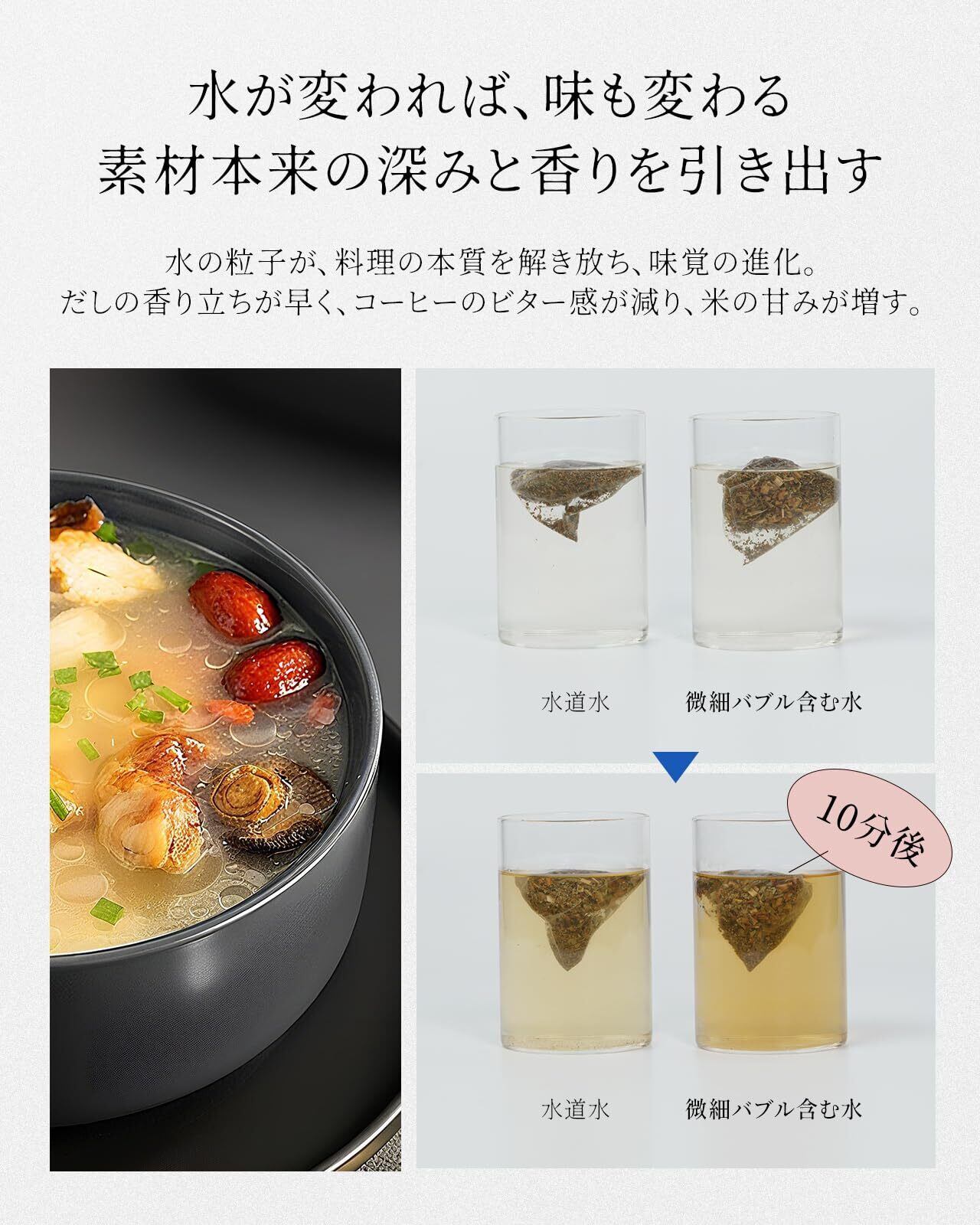 【約6.55億個/mLのマイクロ&ナノバブル洗浄】ウルトラファインバブルが汚れの奥まで浸透し、油汚れ・農薬残留・ヌメリを浮かせて除去。食器・野菜・手洗いまで、水を“洗浄力の高い水”へ進化させます。