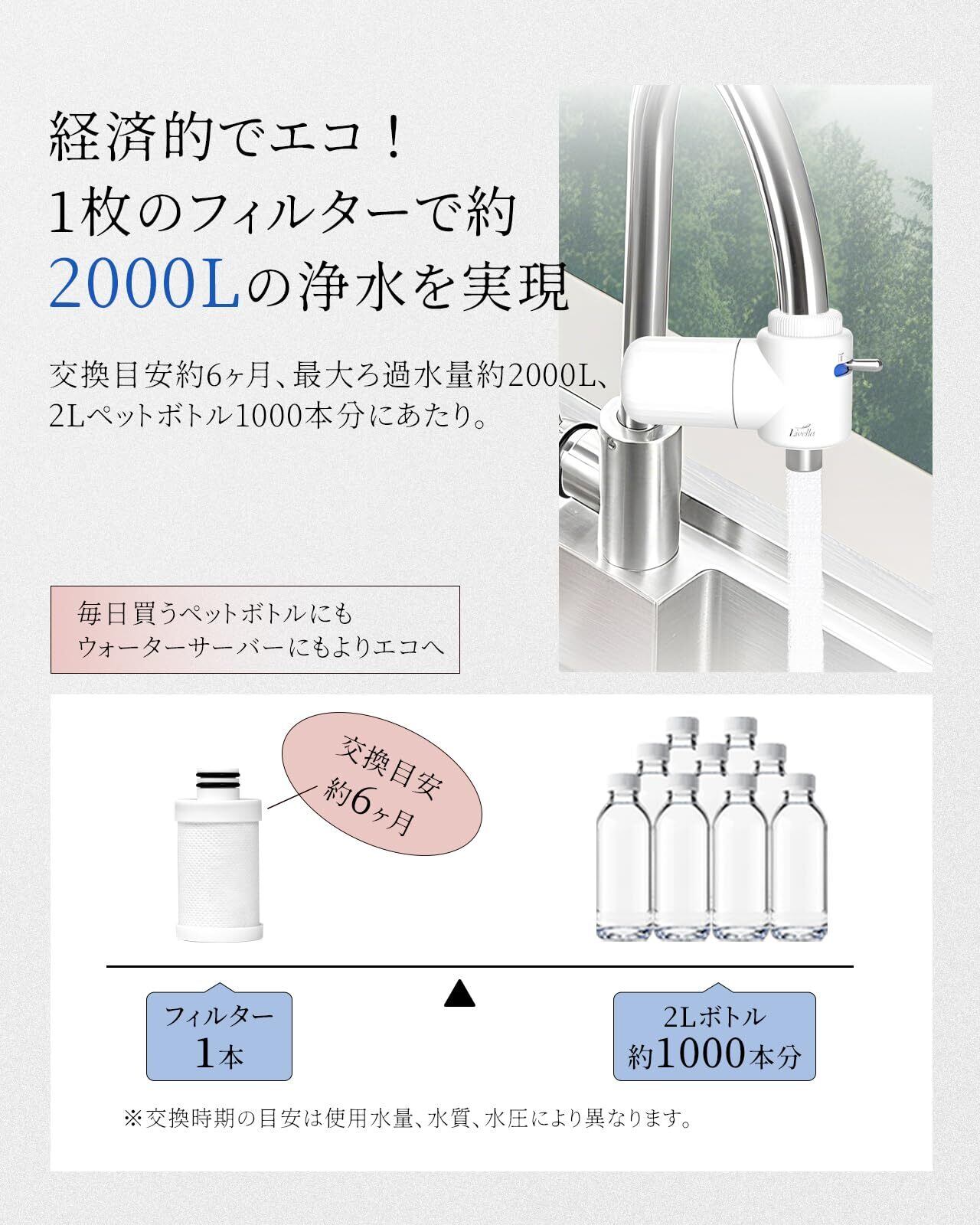 【2000L長寿命&簡単取付】1本のフィルターで約2000L(目安約6ヶ月)。工具不要、蛇口に直結するだけ。12ヶ月メーカー付き。