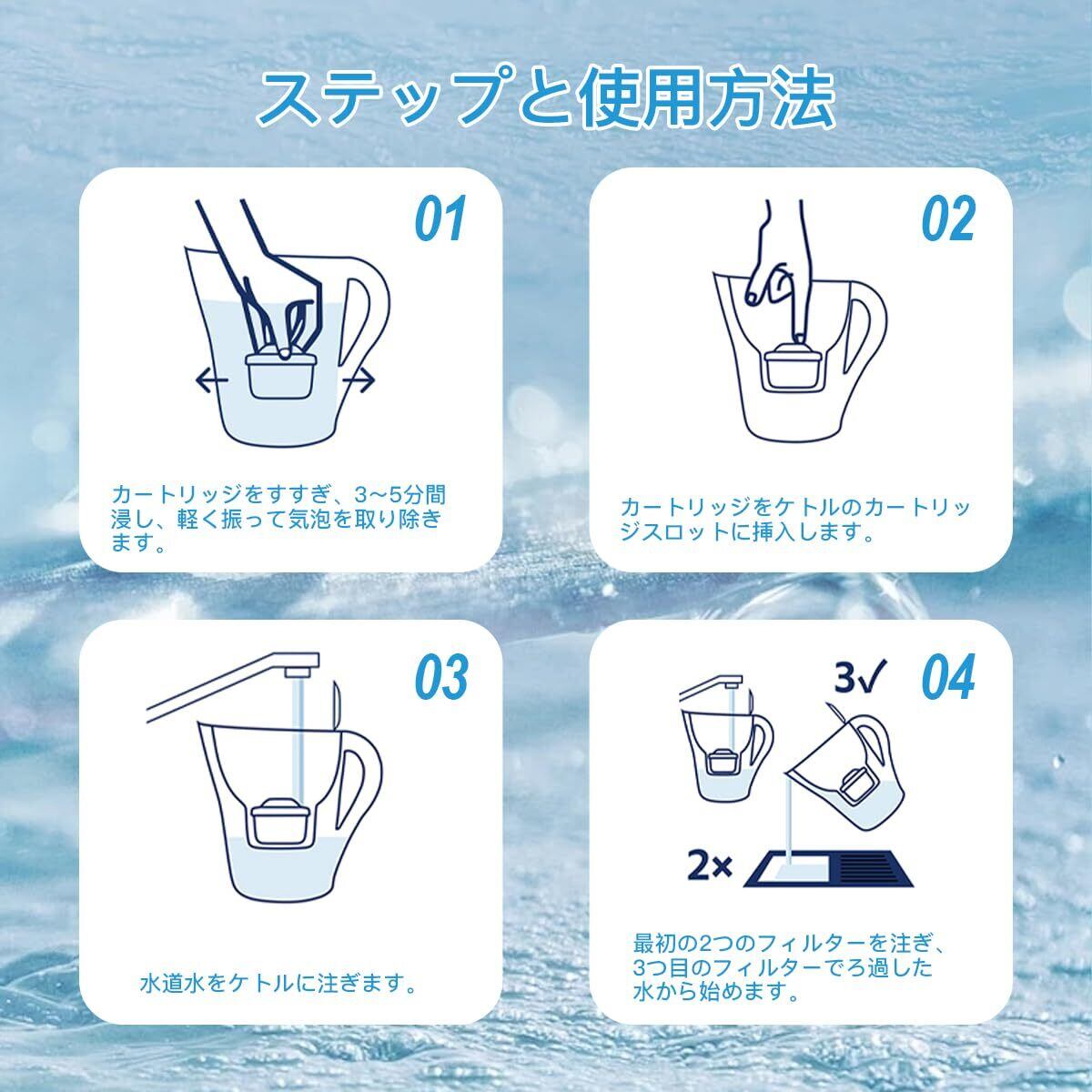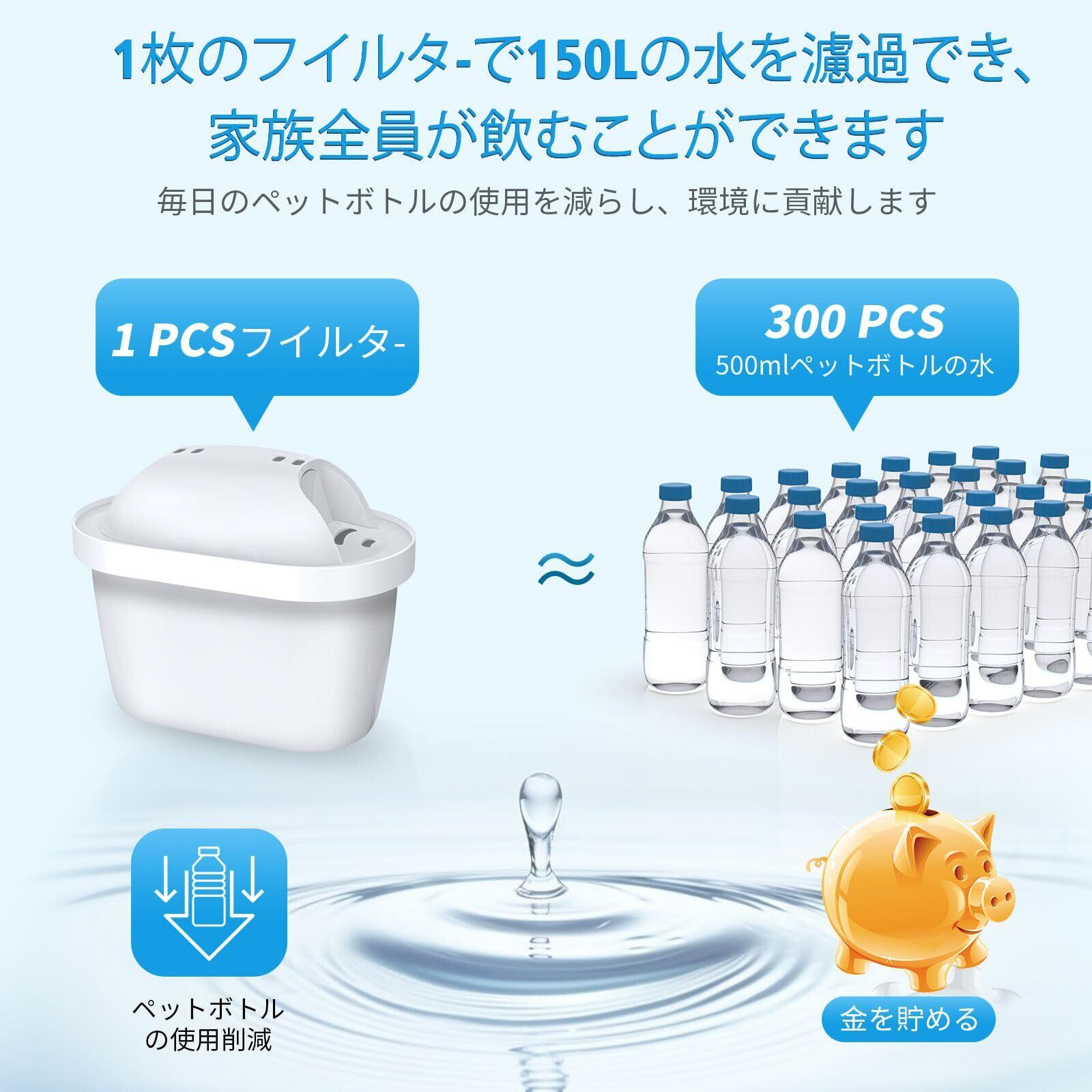 交換周期: 6つの水フィルターが含まれてお、通常の状況下で、フィルターは1ヶ月間使用することができ、水自体の品質に応じて、150リットルの水の1ヶ月のろ過は、1つのフィルタの使用は、環境の利益のために、約300 0.5Lのペットボトルの水を節約することができます。フィルターカートリッジの交換目安は、4~6週間に1回です