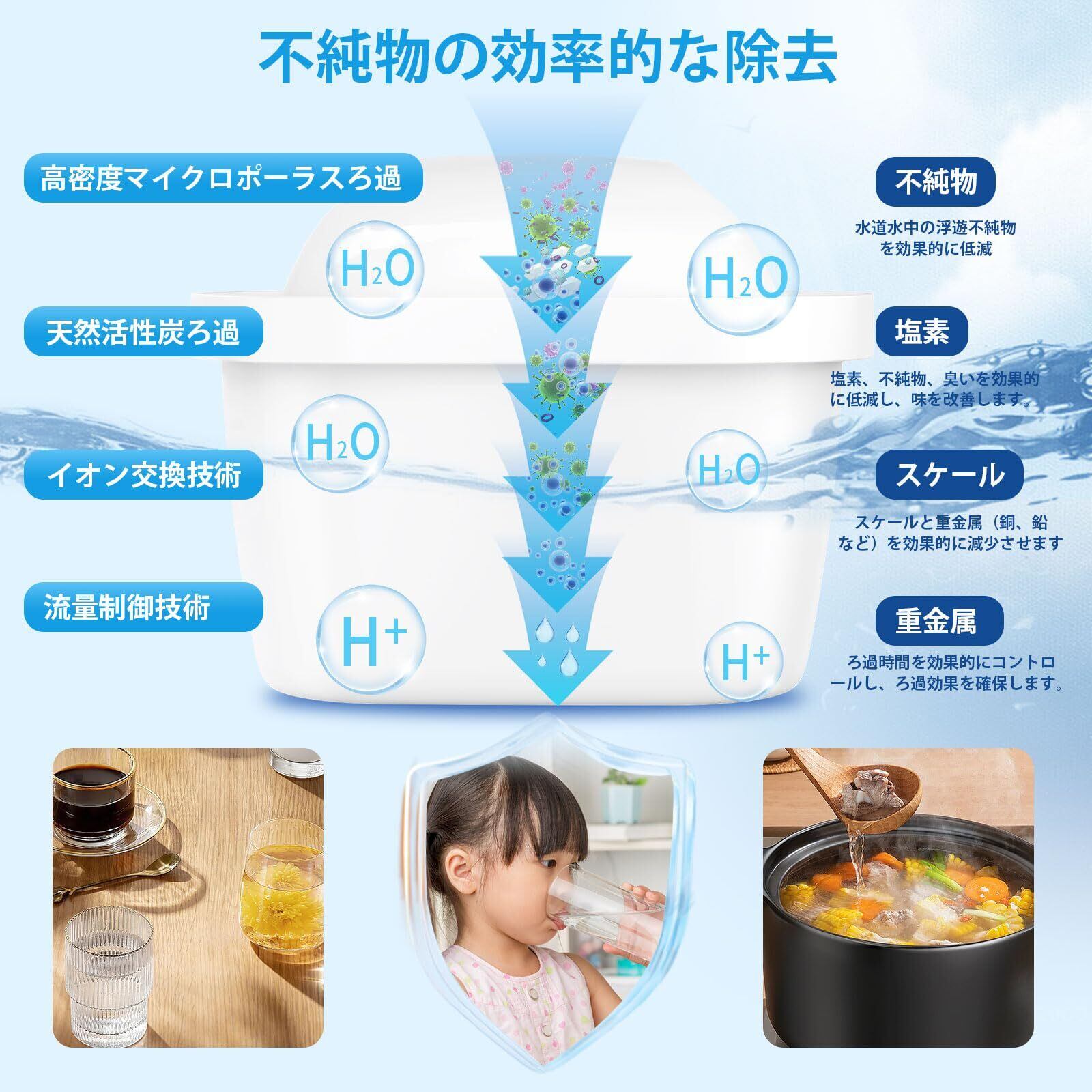 高品質の浄水器: 必須ミネラルを保持しながら、様々な不純物を効果的に除去します。いつでもどこでも新鮮な水を楽しむことができます!フィルターでろ過された水は、飲料水から料理まで、さまざまな用途に安全かつ確実に使用できます!健康な生活はおいしい水から