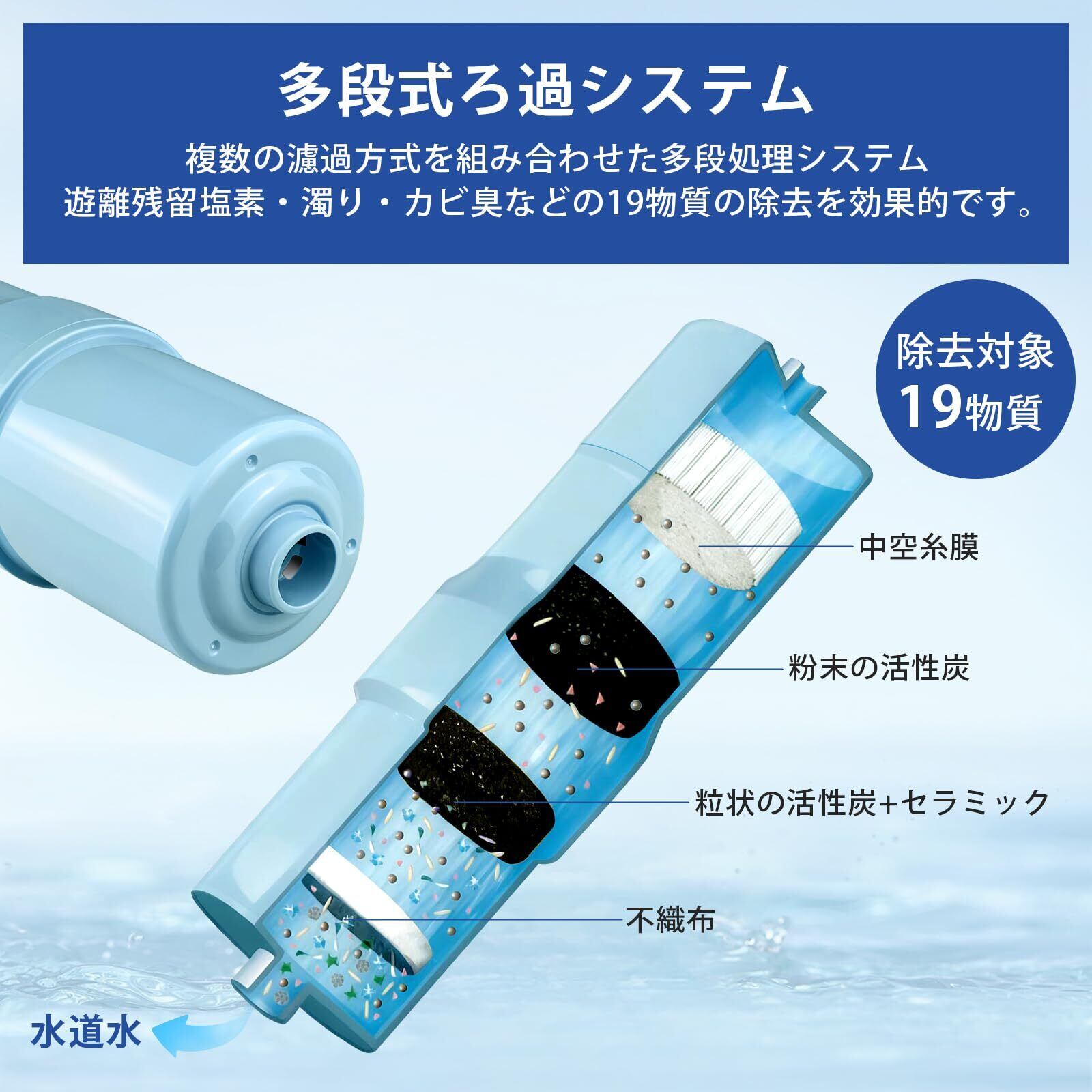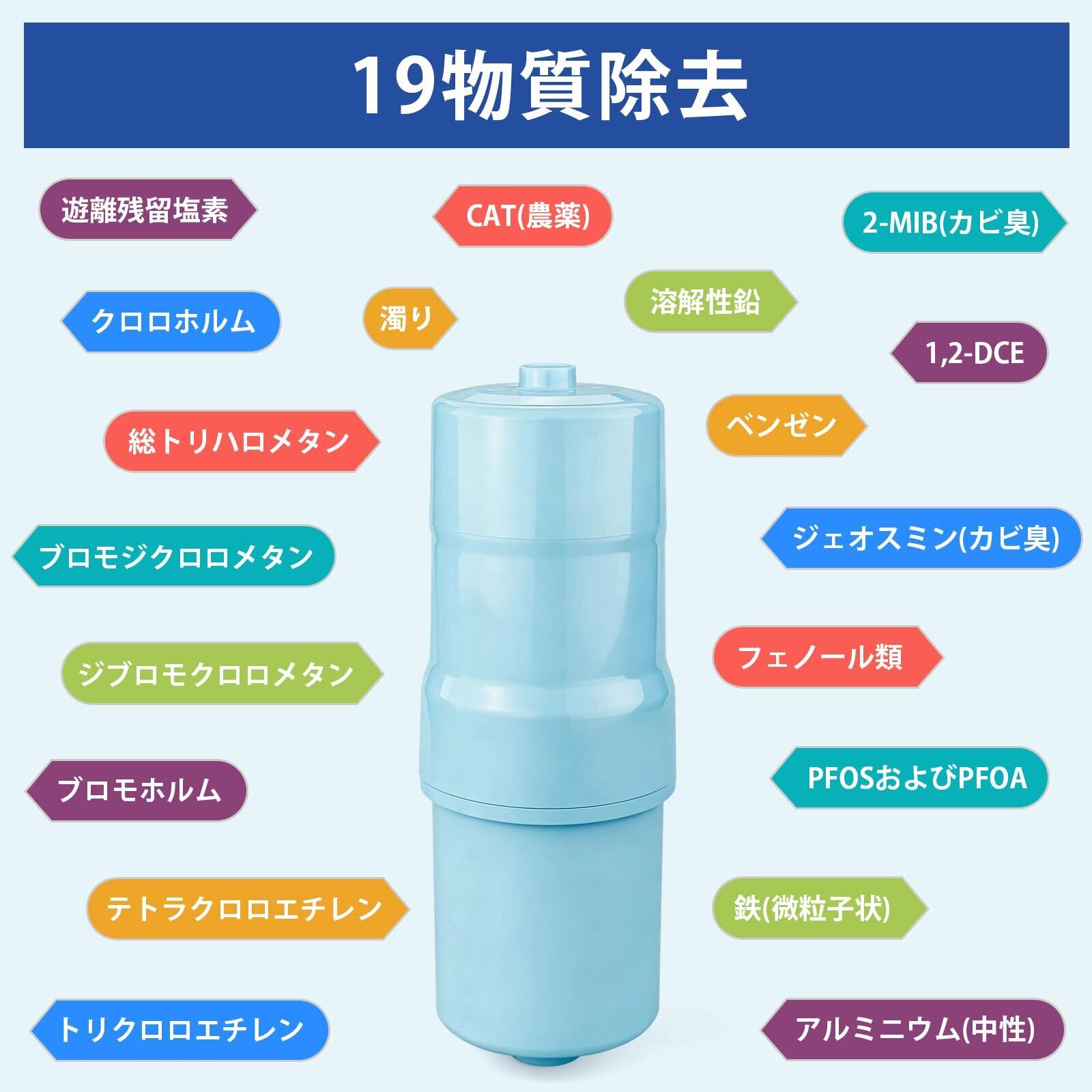 【PFOS・PFOAを含む19物質除去】遊離残留塩素、濁り、クロロホルム、ブロモジクロロメタン、ジブロモクロロメタン、ブロモホルム、テトラクロロエチレン、トリクロロエチレン、総トリハロメタン、CAT(農薬)、2-MIB(カビ臭)、溶解性鉛、1,2-DCE、ジェオスミン(カビ臭)、ベンゼン、フェノール類、PFOS及びPFOA、鉄(微粒子状)、アルミニウム(中性)