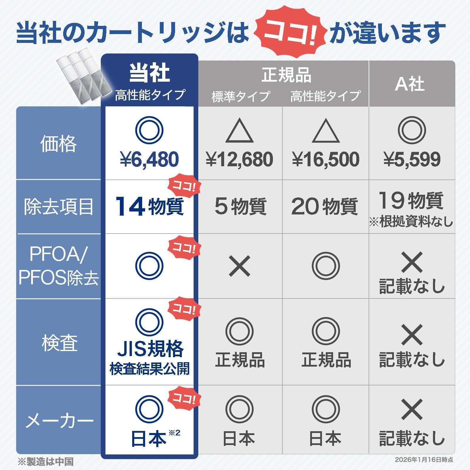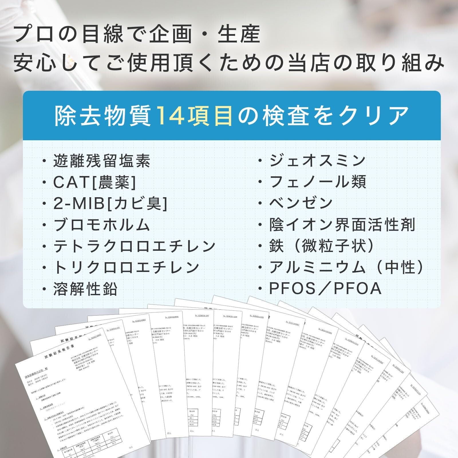 浄水能力: 14物質除去。(遊離残留塩素、溶解性鉛、CAT、2-MIBカビ臭、ブロモホルム 、テトラクロロエチレン、トリクロロエチレン、フェノール類、ジェオスミン、ベンゼン、陰イオン界面活性剤、鉄(微粒子状) 、アルミニウム(中性)、PFOS/PFOA) ろ材の種類: 中空糸膜、イオン交換繊維、活性炭、不織布。(一部パッケージには除去項目の反映、記載がございませんが、浄水能力は間違いなく試験にて14項目確認済みですのでご安心下さい。) * カートリッジの取替時期の目安: 1日に8Lご使用の場合、約4ヶ月/個。×3個で合計1年分です。(取替時期の目安は、ご使用の水量・水質・水圧などにより異なります。)