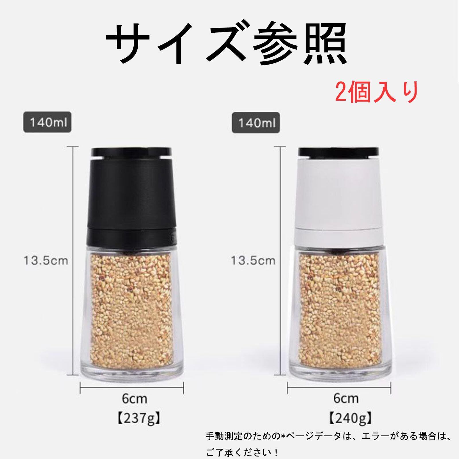 2個セットで使い分けが便利:本品はブラックとホワイトのペッパーミル2個セットで、異なる種類の胡椒や調味料を使い分けられます。40mlの小型サイズ(高さ12cm)ながら、約30gの胡椒を収容可能。コンパクトでキッチンや食卓のスペースを取りません。