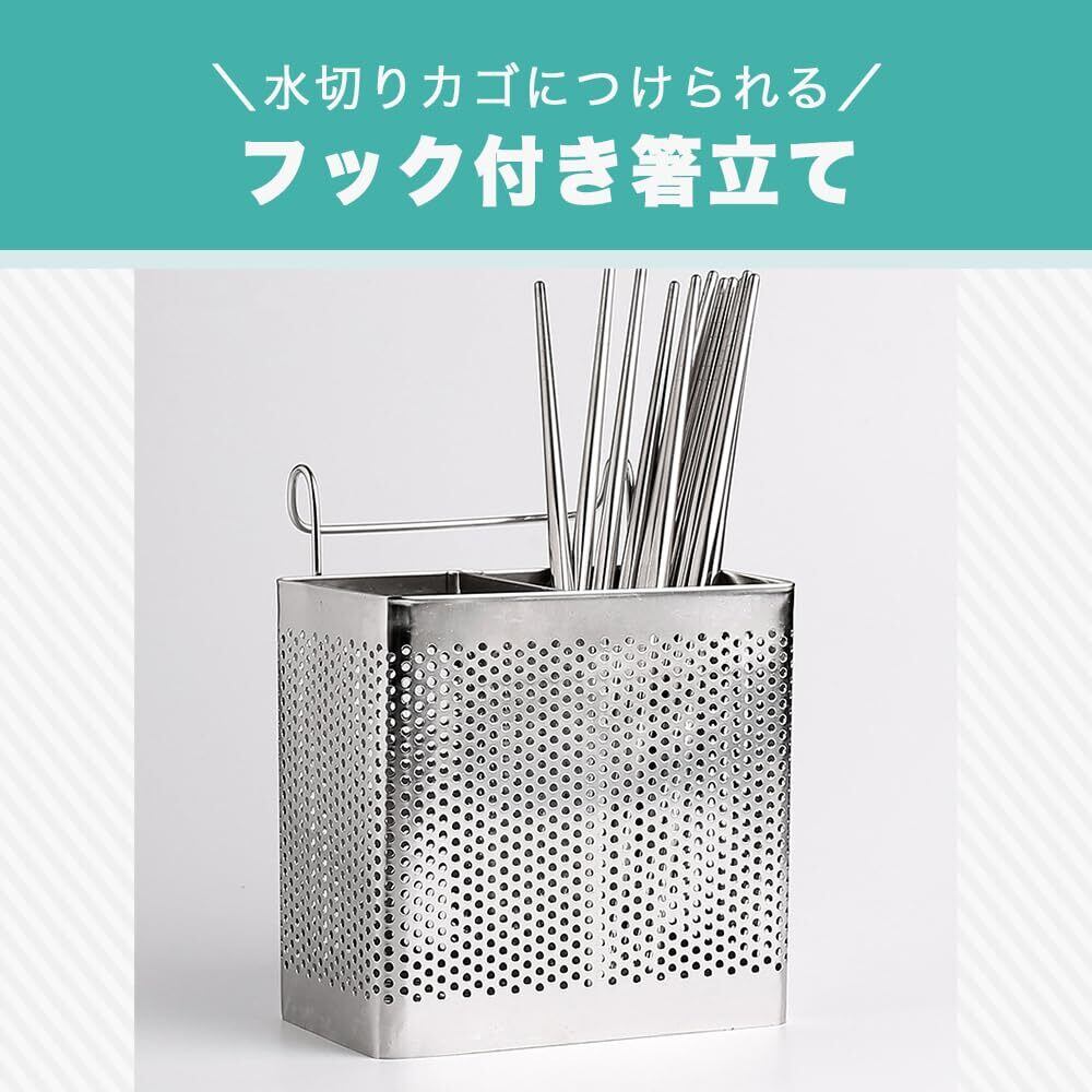 【フック付き箸立て】水切りカゴに掛けて使用できる箸立てです。机に置いて使用することもできる商品です。全面に穴が開いているため水切り機能も抜群に良くカトラリーを清潔に乾かすことができます。
